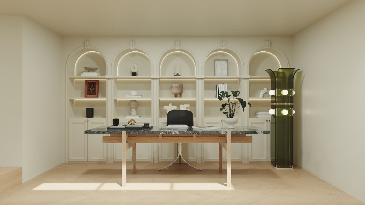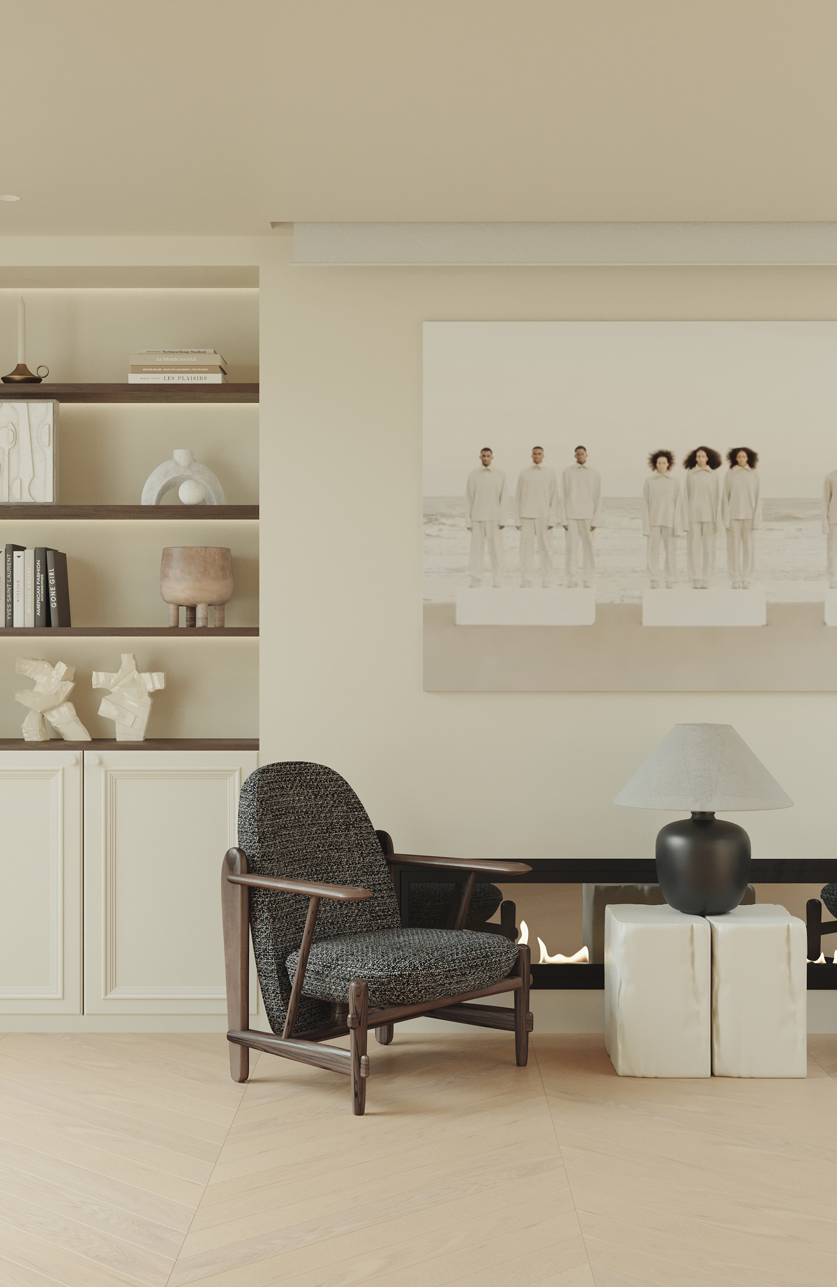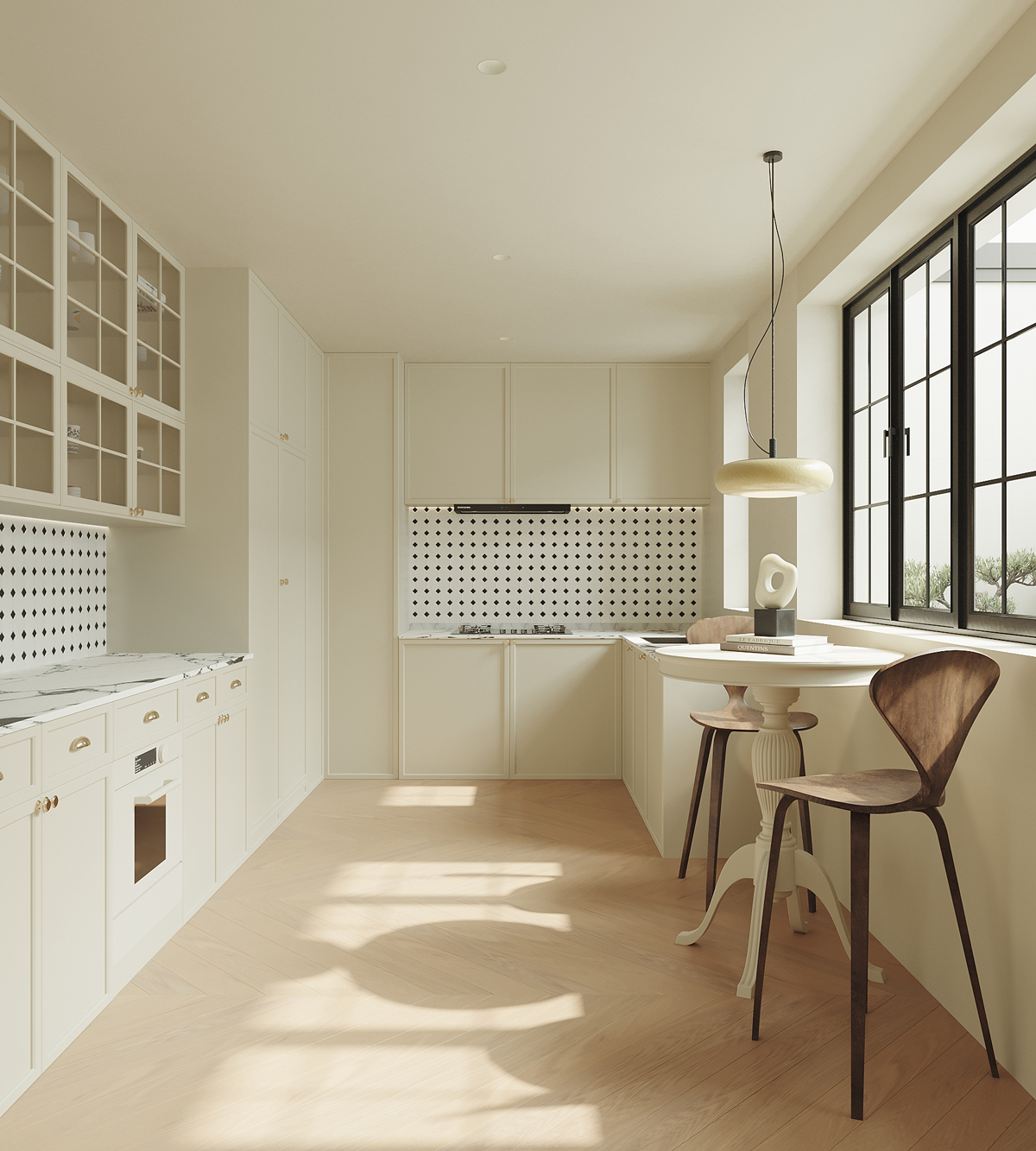 整体选用柔和的色调、大面积温暖质感的木地板以及小部分石材,使空间氛围温馨又具有贵气质感:风格上没有过多运用法式元素,整体营造有轻松氛围的轻法式。