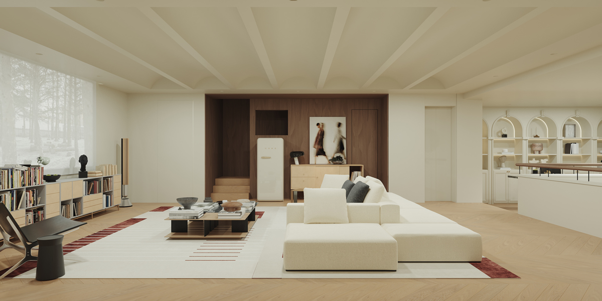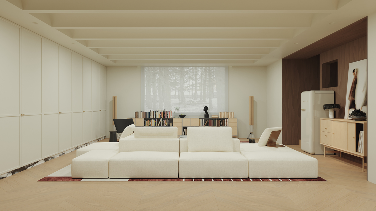 又打通了家政间外的小空间增加水吧区。软装上采用模块沙发,灵活摆放,满足多种模式下的使用体验。