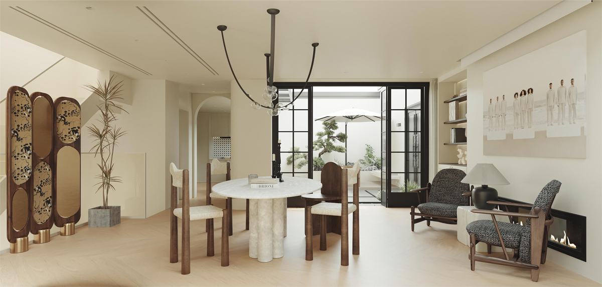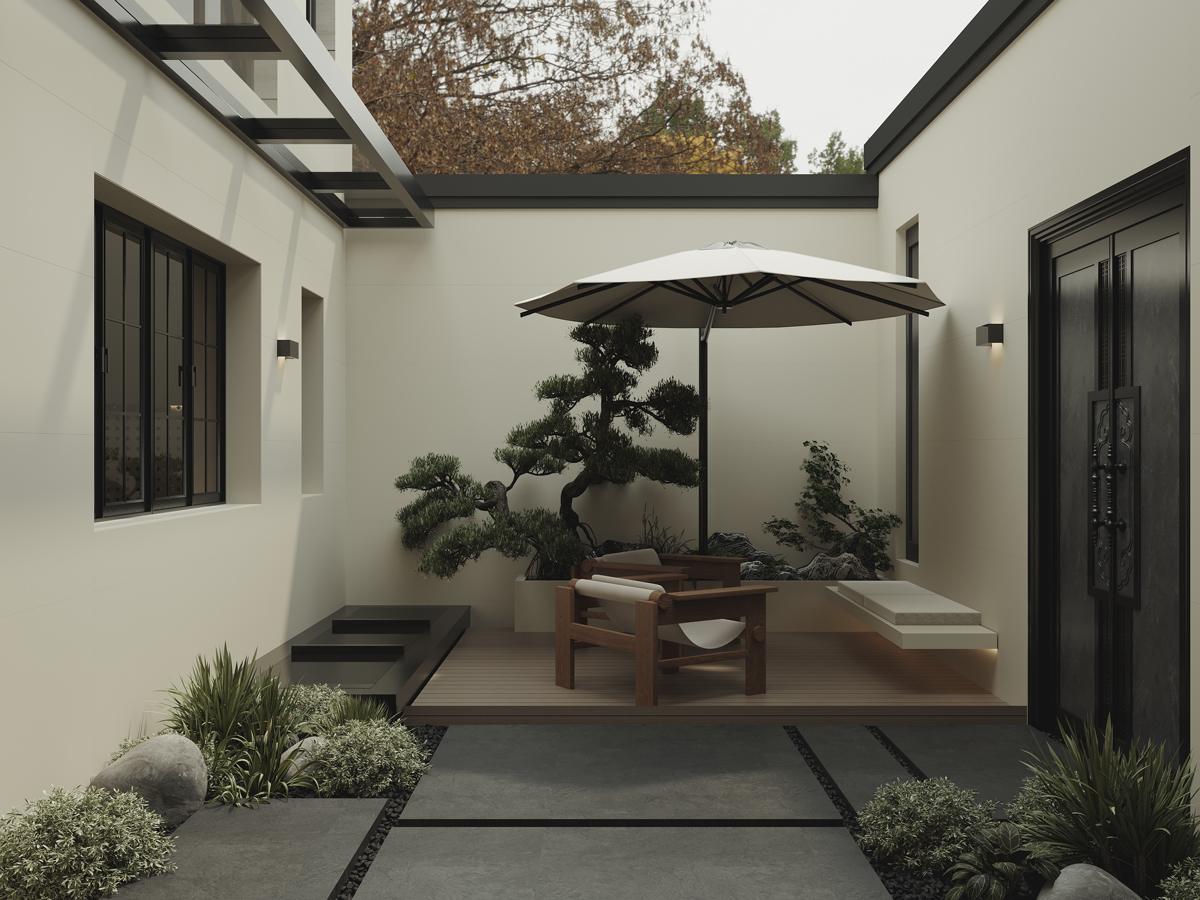 改动连接庭院和室内的墙体后,庭院的围合感增强,厨房和庭院之间新增的窗户可以进行空间的联动,同时改变入户的双动线,优化风水。
