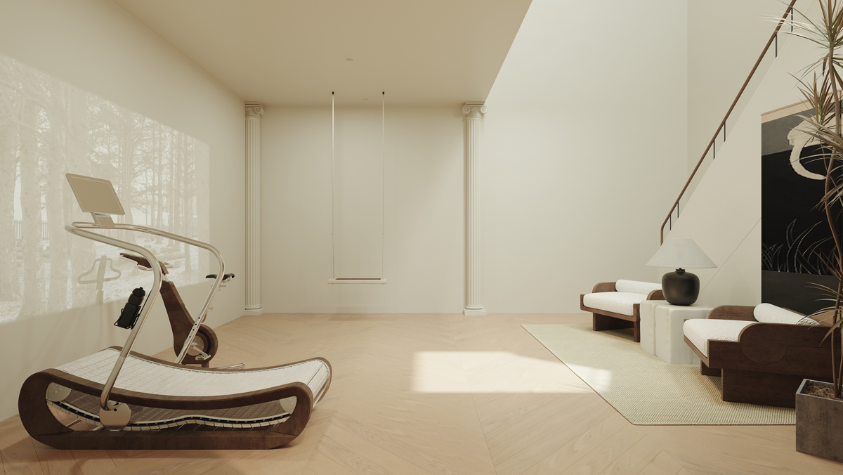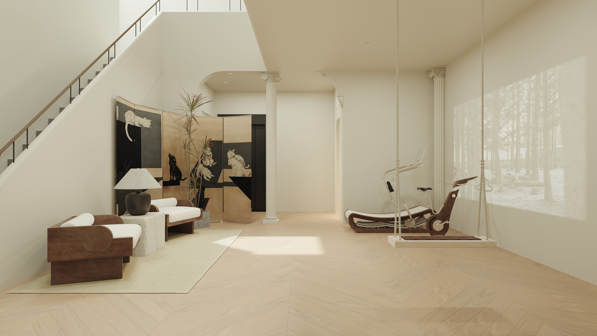 硬装上改变了原玻璃楼梯扶手,搭建部分的承重立柱用象征高贵典雅的爱奥尼柱式做了装饰,搭建楼板预埋吊环放置秋千。女主坐在秋千上看男主锻炼,这样的场景也太浪漫了吧。