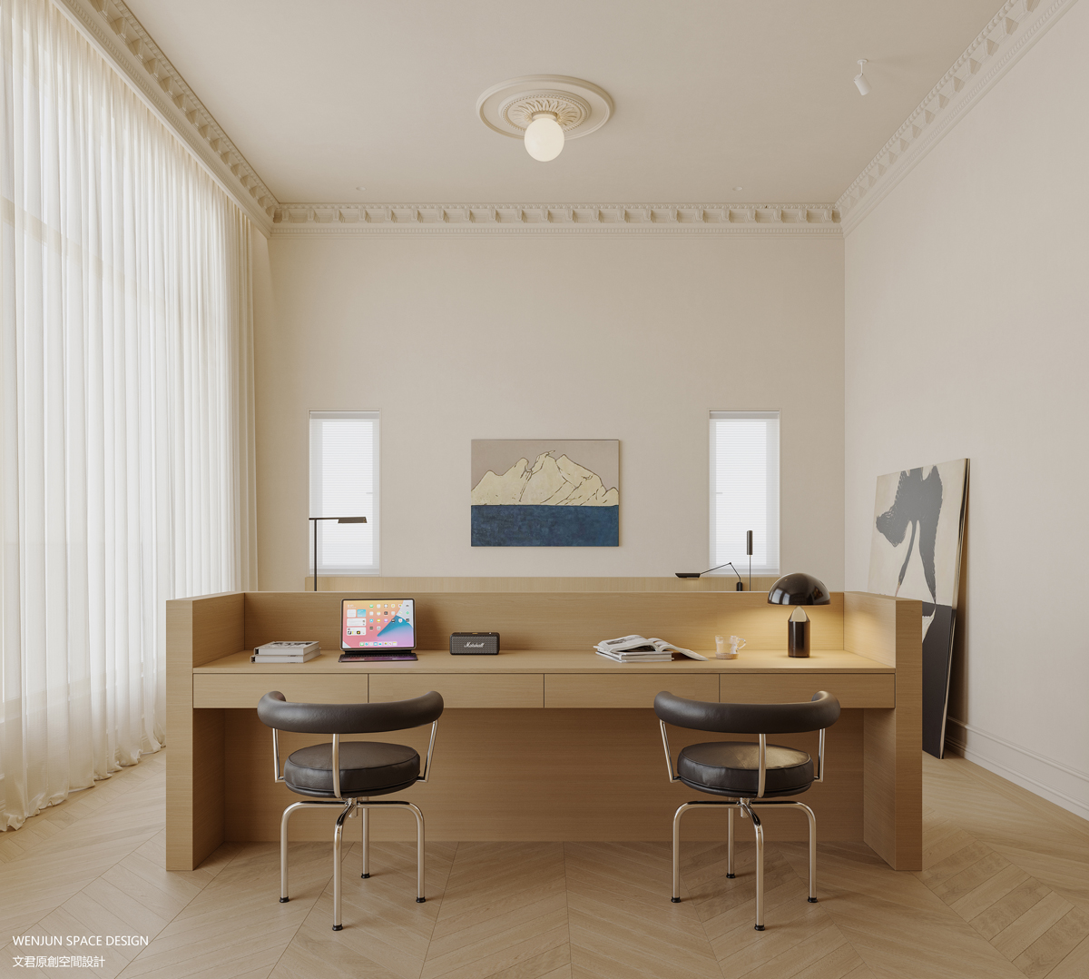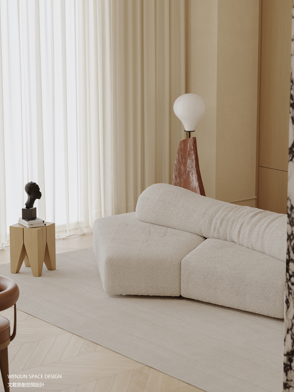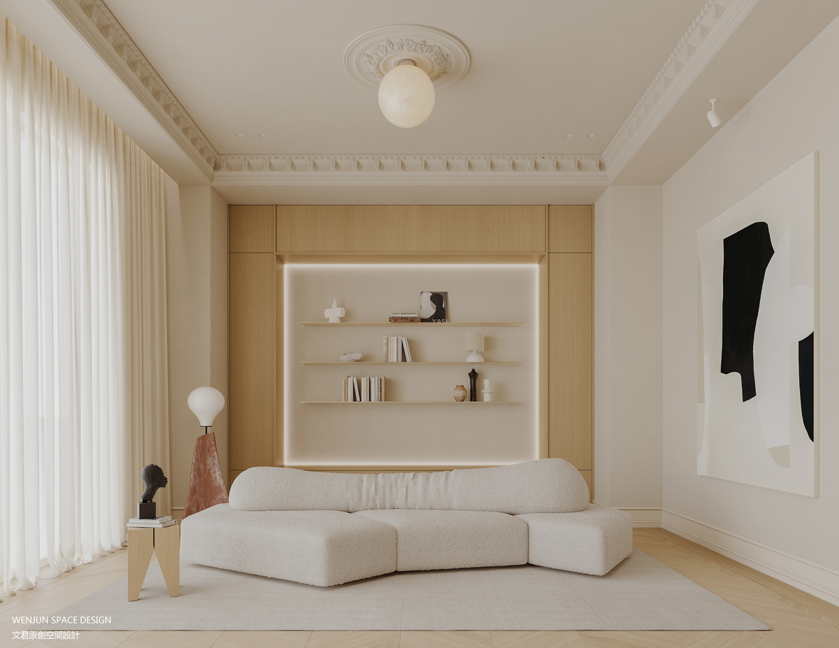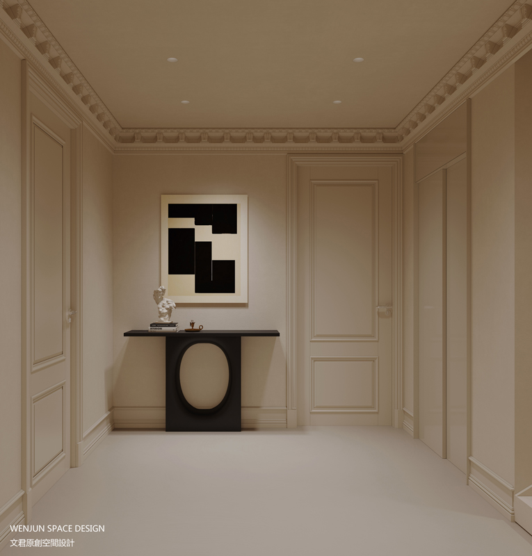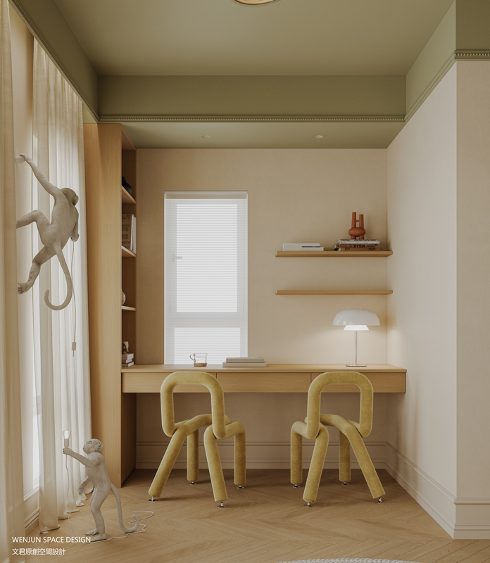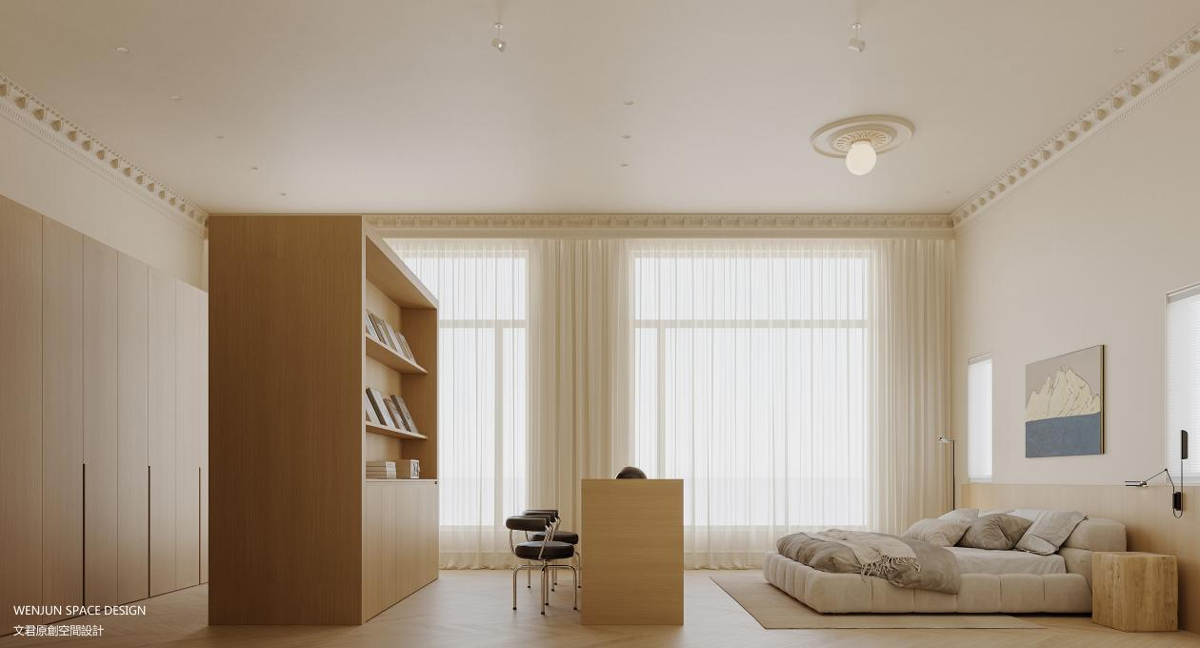 在主卧室,我们做了套间的形式,打造主卧室的全面空间的概念,融合书房、卧室和衣帽间,并将三者以洄游动线的设计手法,串联在一起,让空间得到了最大的利用。