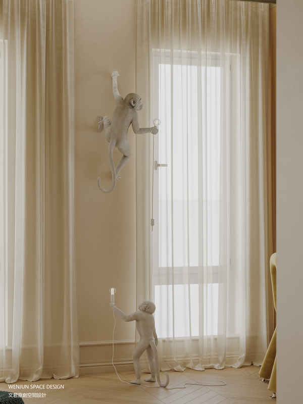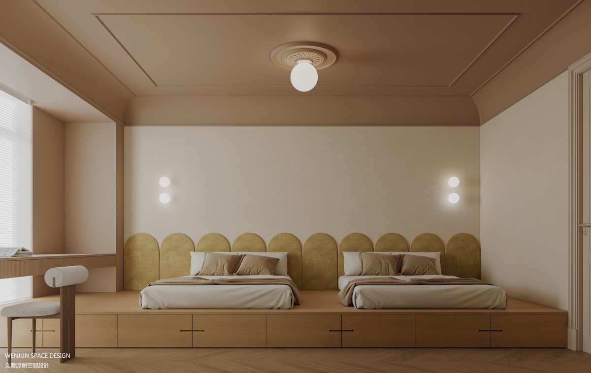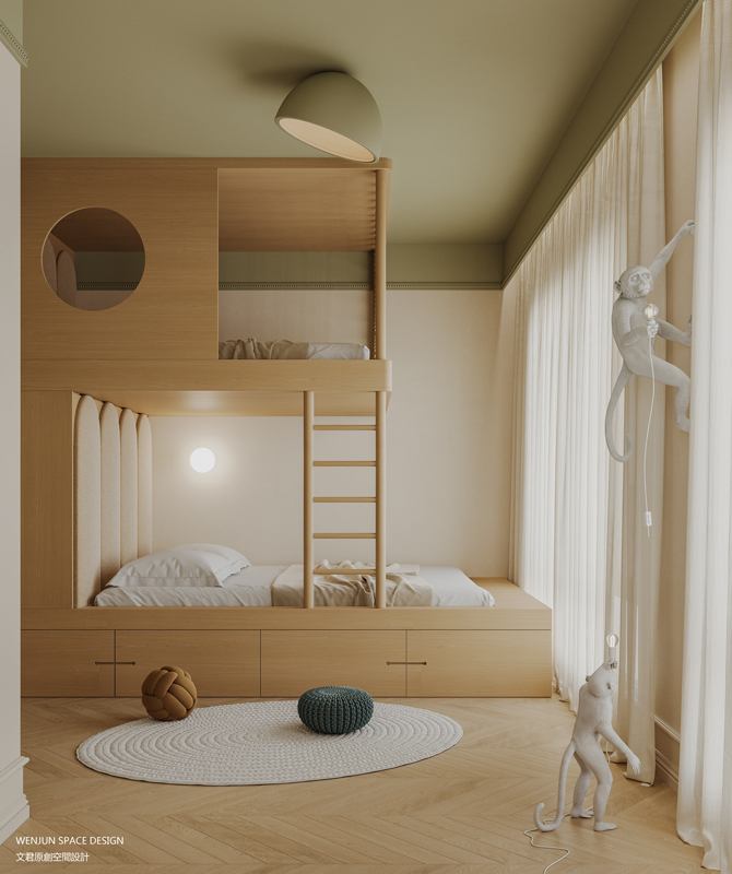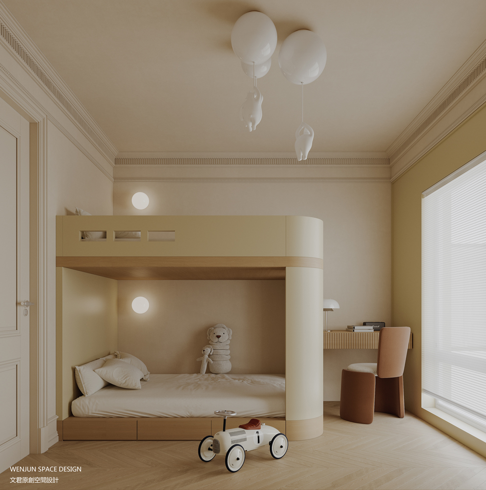儿童房设计风格以简约为主,用了大量的留白,让孩子保留童真的想象空间,同时也加入了一些趣味的元素,比如房间内部的造型、拓展游戏、几何图案等等,可以让孩子产生好奇心并开发他们的想象力。