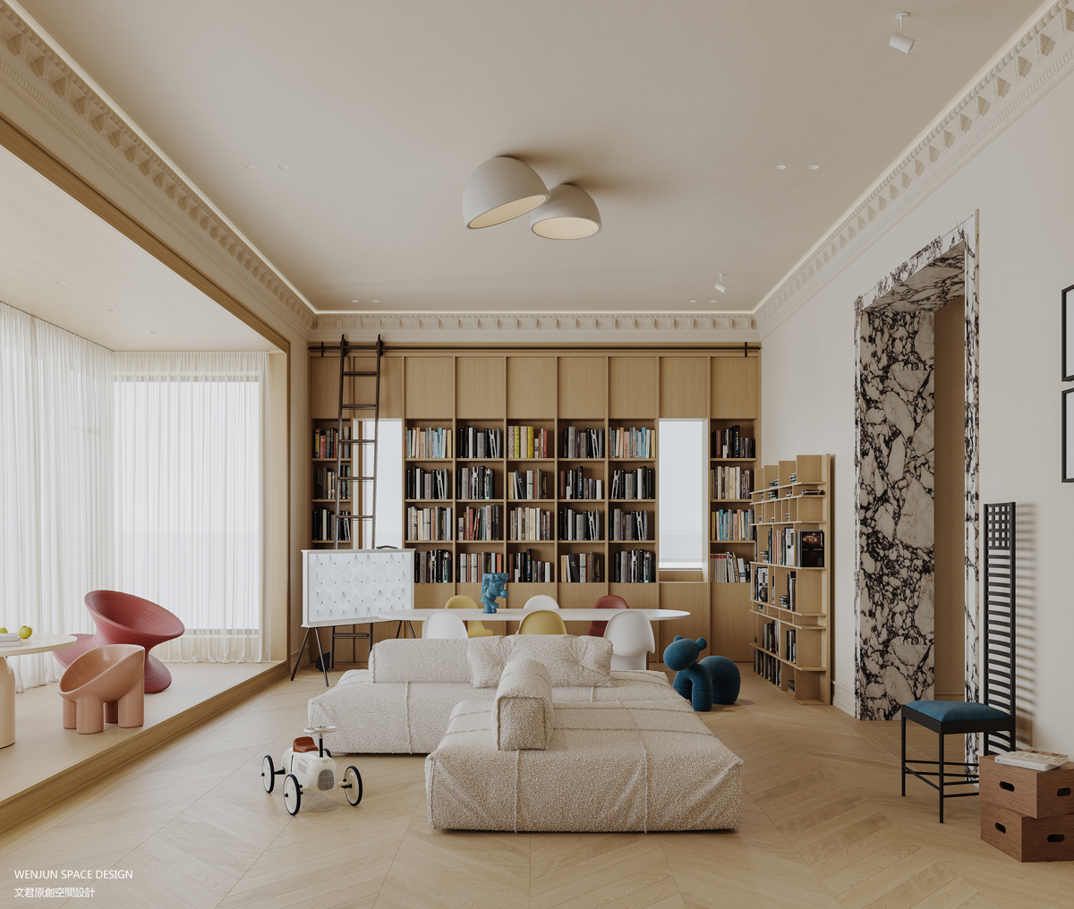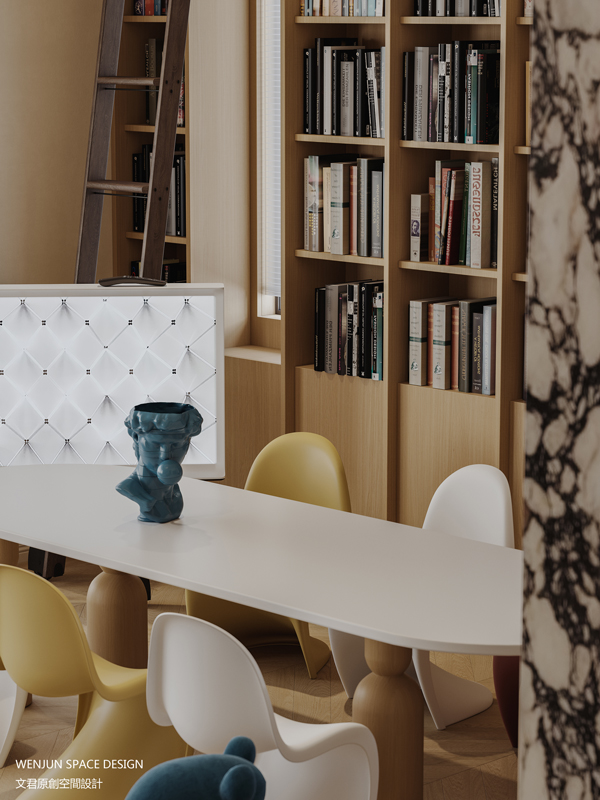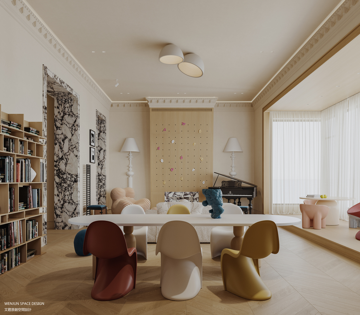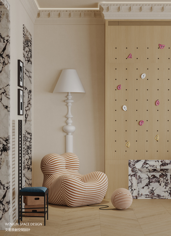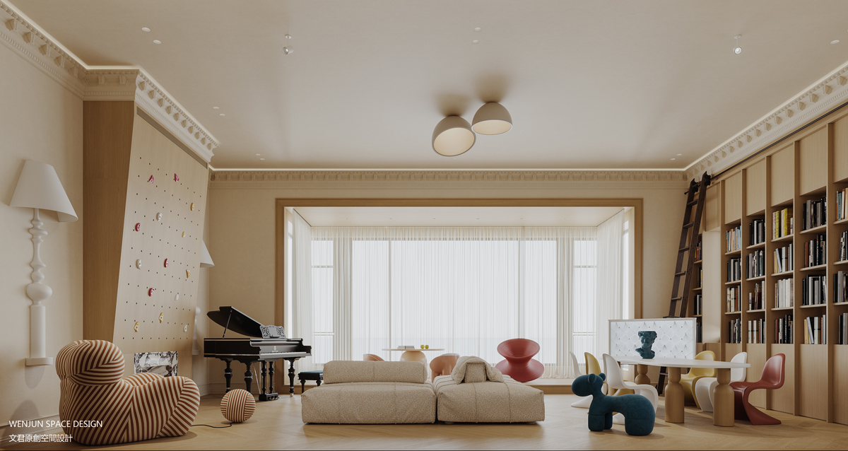 所以我们在设计时,室内多为开放式格局,在客餐厅、起居室、卧室套间、大床儿童房等等,加入了室内攀岩墙、上下床设计、地台玩耍区、积木多彩书架等元素,让一家人可以最大程度地实现交流互动。