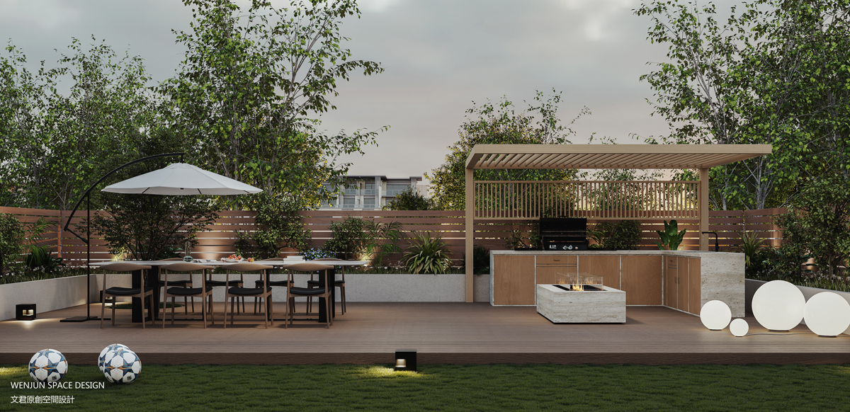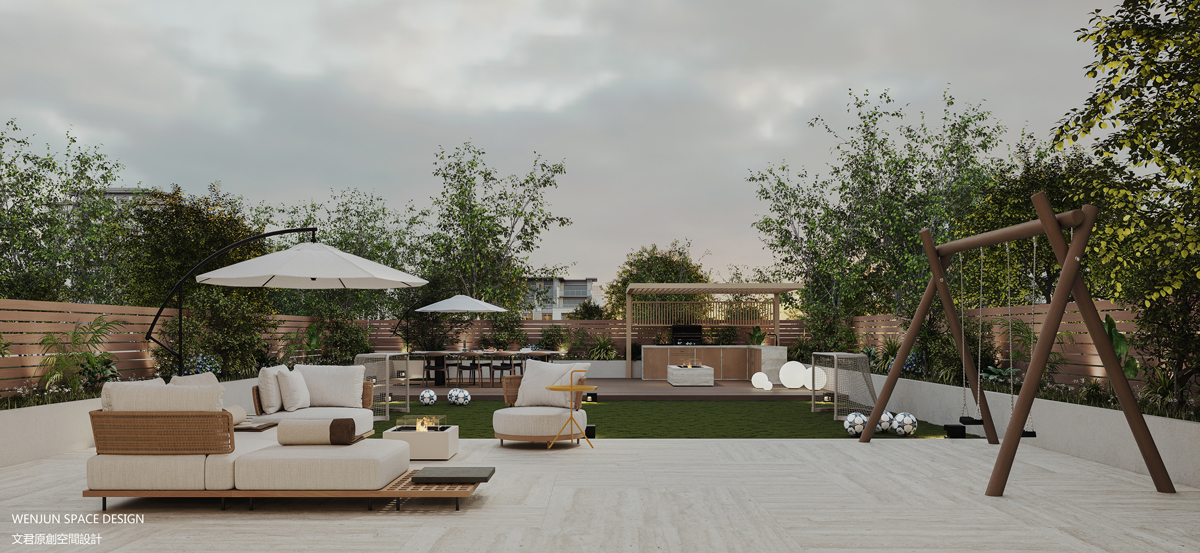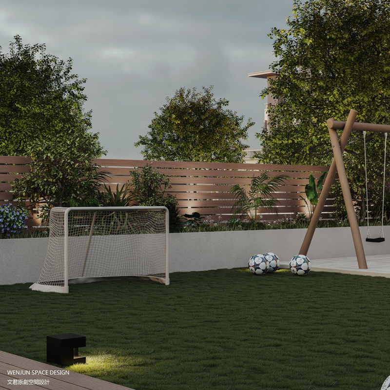 室外庭院不仅仅是有烧烤、休息以及运动场地足球场等常规庭院设计,更是将室内外通过一个滑梯作为联系,既满足了孩子玩耍的需求,又达到了室内外的一个沟通。