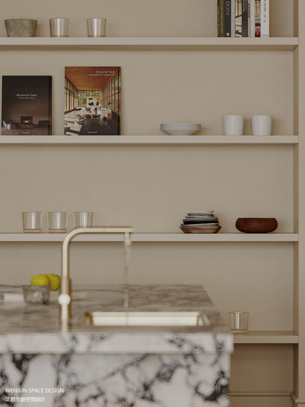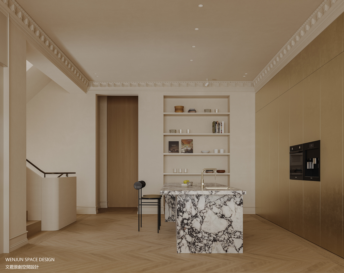 一整层的厨餐厅,容纳了西厨,超大旋转餐桌和书房功能,集合了实用和美观度。