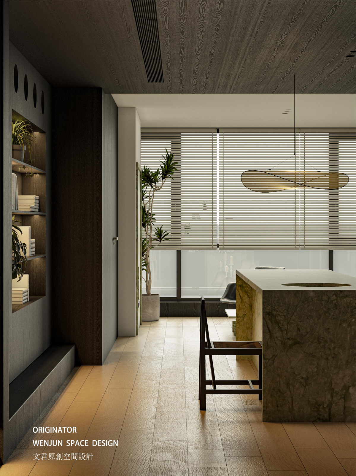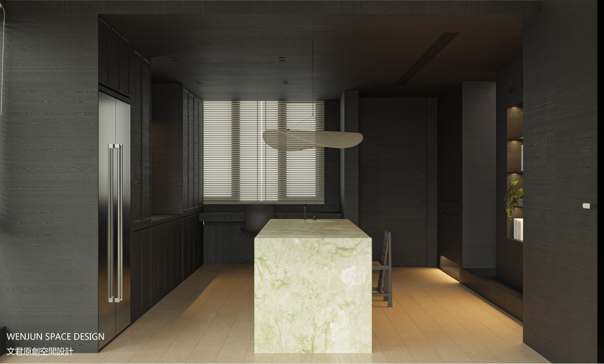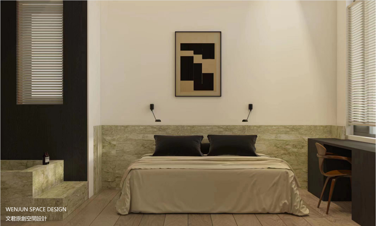 复式书房及卧室,极简风格,大胆采用绿色石材与黑色木皮搭配碰撞。