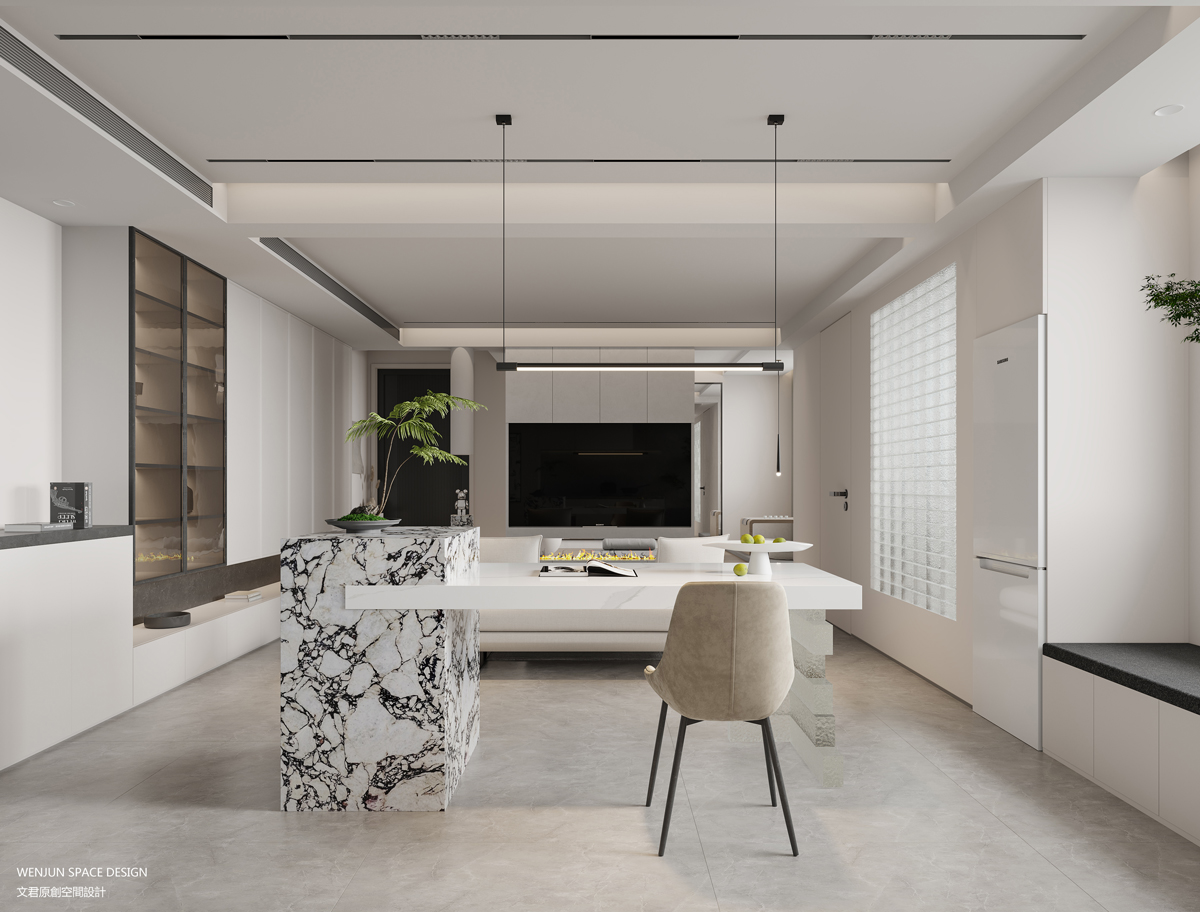 通过餐厨、客厅、多功能(瑜伽区、茶室)区构成轴线关系;