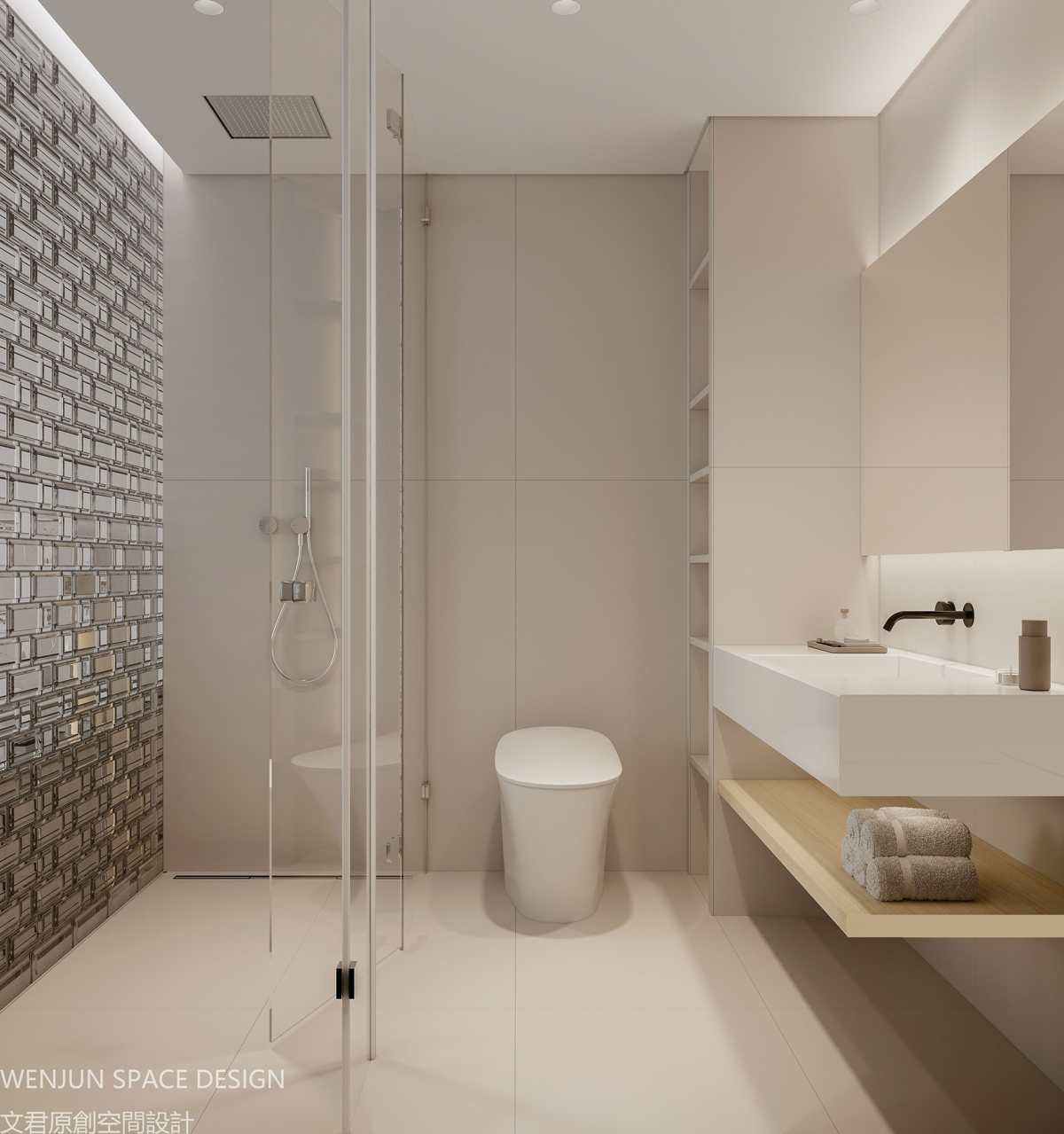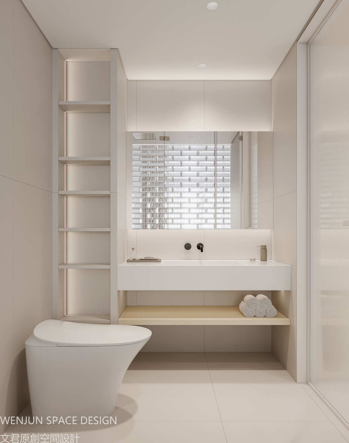 干湿分离的卫生间区域,加上壁龛柜橱的收纳功能,隐藏式设计把空间变的整洁有序。