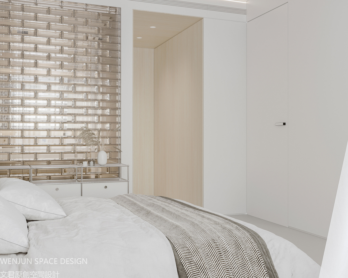 大理石与长虹玻璃色组合,在通往卧室、浴室的走廊间形成一道别致的屏风隔断。主卧由玻璃砖墙隔断主卫,共享来自窗外的自然光。