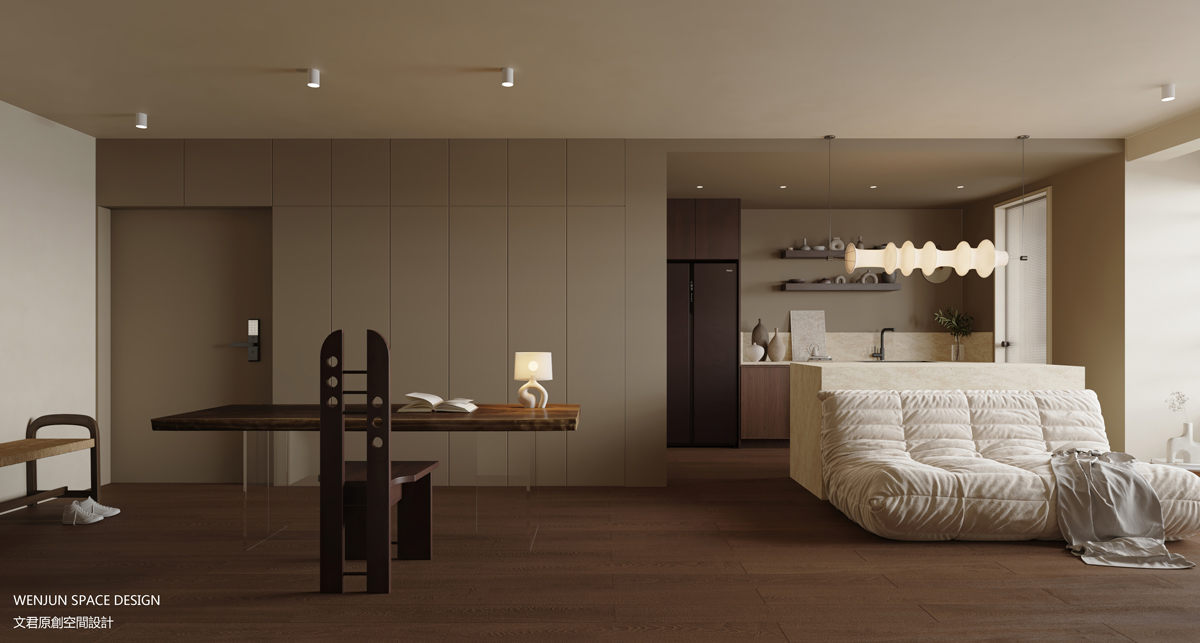 基于屋主大部分是一个人生活,我们还打通了客厅、餐厅、厨房的墙体,做了一体化处理,让整体公共区域可视化,通过设计让家里更简洁,也更有烟火气。