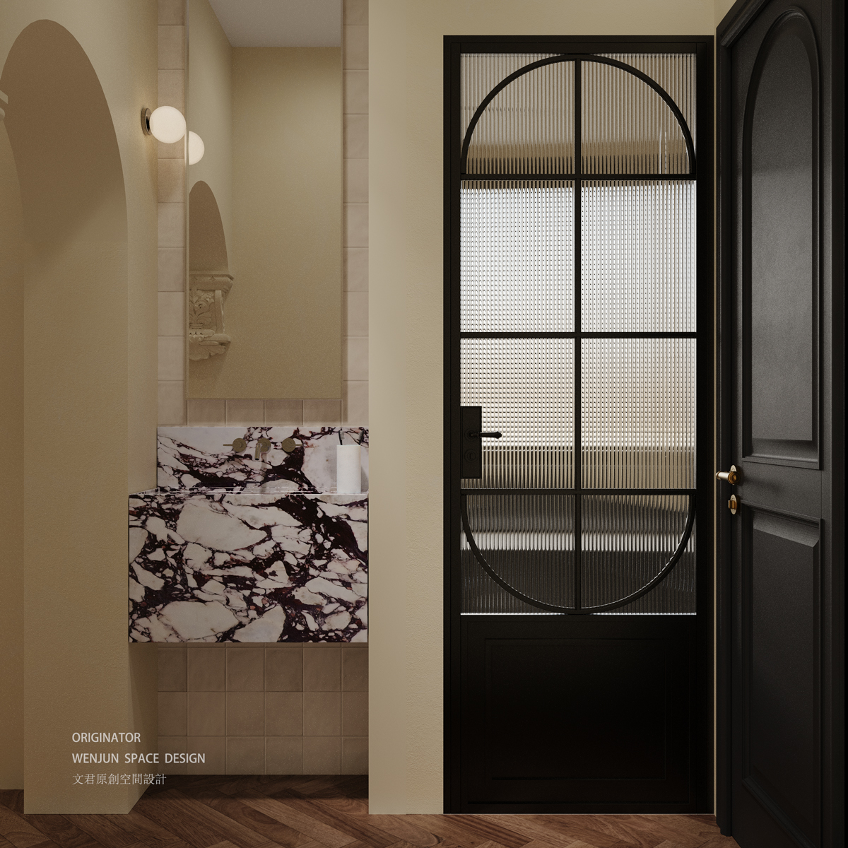 宝格丽石材勾勒的黑白花纹洗手台,典雅又干净。对称的门体,与其相辅相成,各自独立又各自衬托。