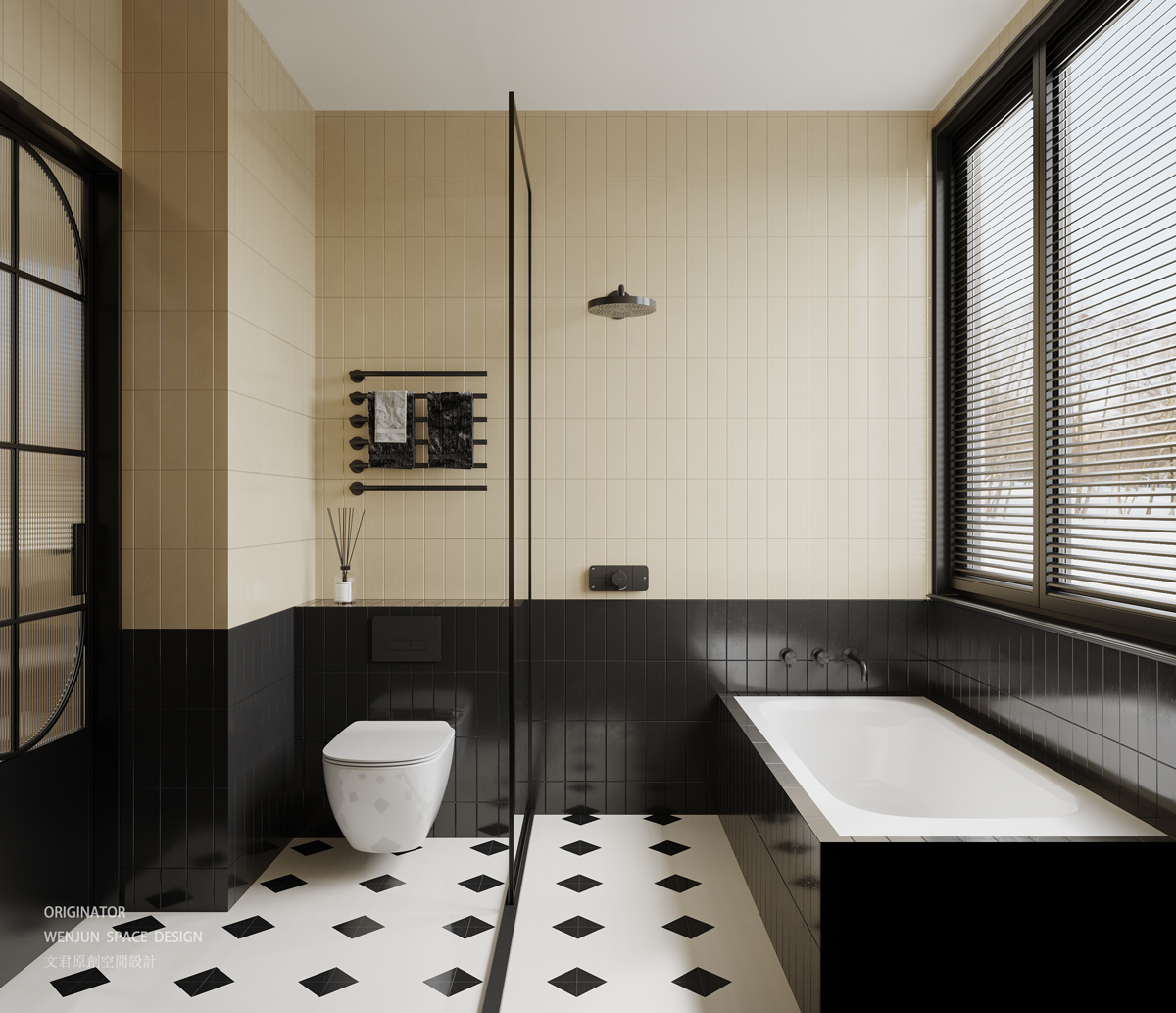 地面胡桃色橡木地板融合经典黑白格元素,风格大胆、有趣,富有时代感。