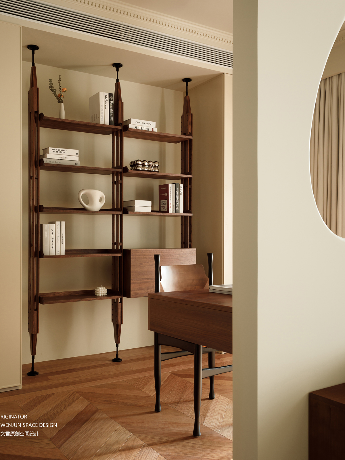 通过镂空设计,休息区和活动区的人可以无障碍沟通和互动,也方便欣赏展示柜上面的书,包包以及收藏品。鱼骨拼地板同样得到沿用,视觉空间也得以延伸。