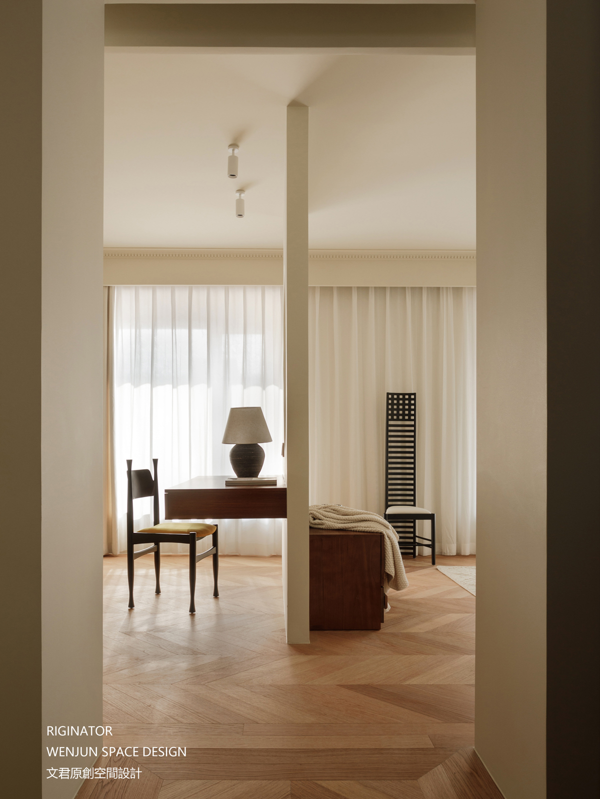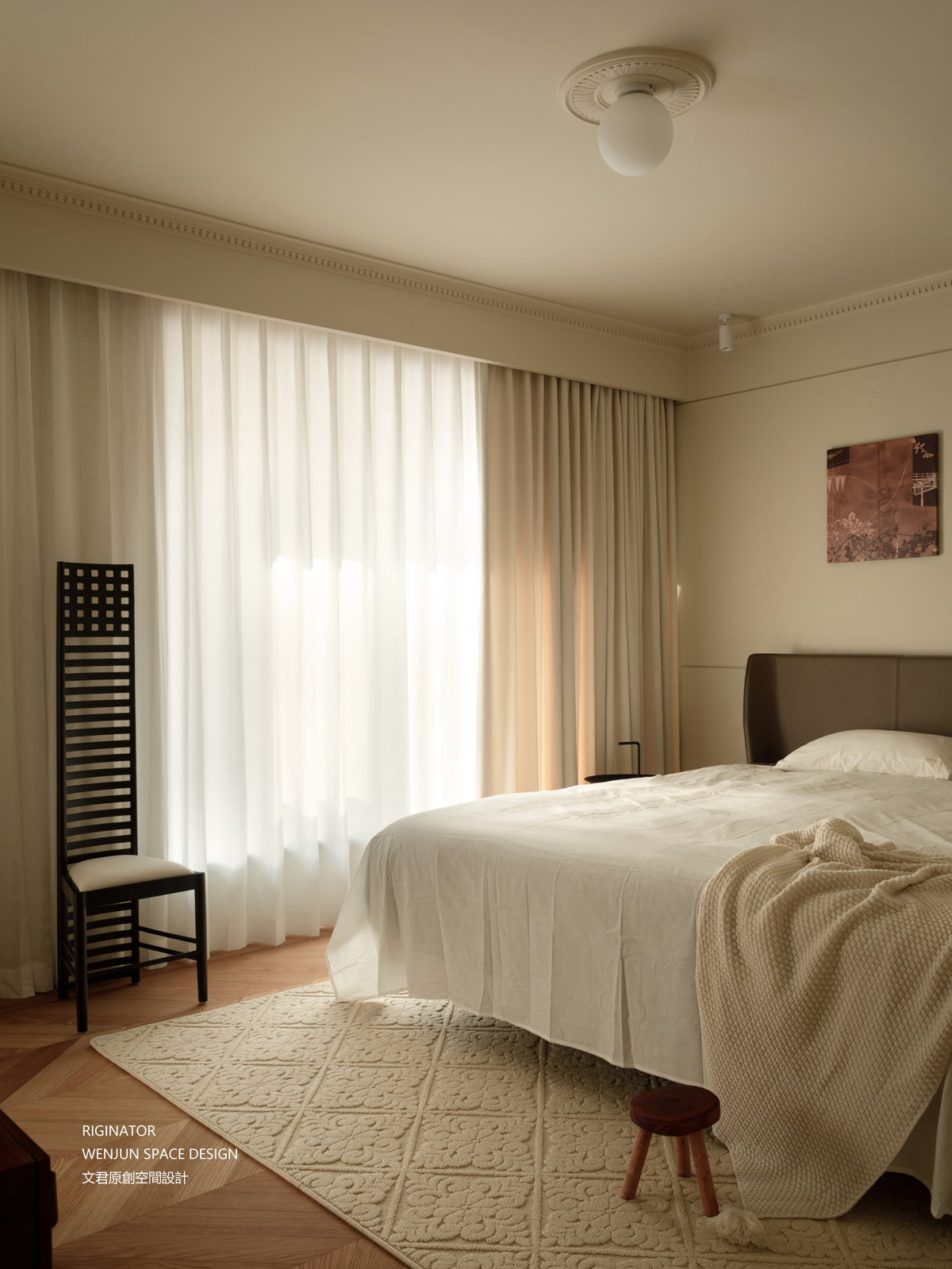 当你躺在床头休息时,视线所及之处不是白墙。我们将休息区和活动区之间的装饰墙体进行镂空设计,使两个空间既独立又统一。