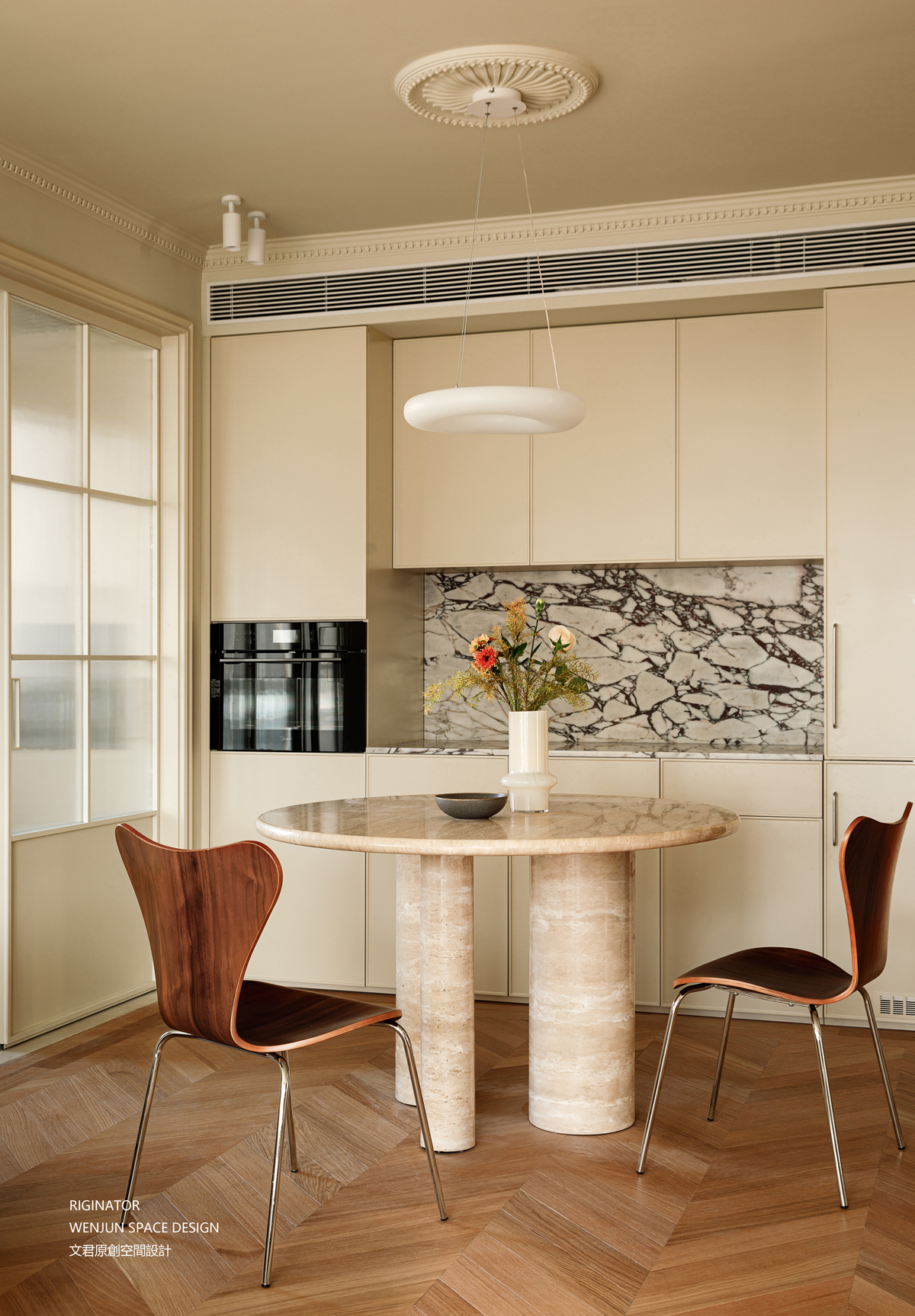 西厨区合并到餐厅区域,在餐厅设立案台和轻法式风格柜体。放置烤箱,方便有烘焙需求的屋主。定制橱柜提供充分的空间,可收纳厨房用具或作为酒柜。细节处使用宝格丽石材点缀,给原本的空间添加了一份沉稳的色彩。