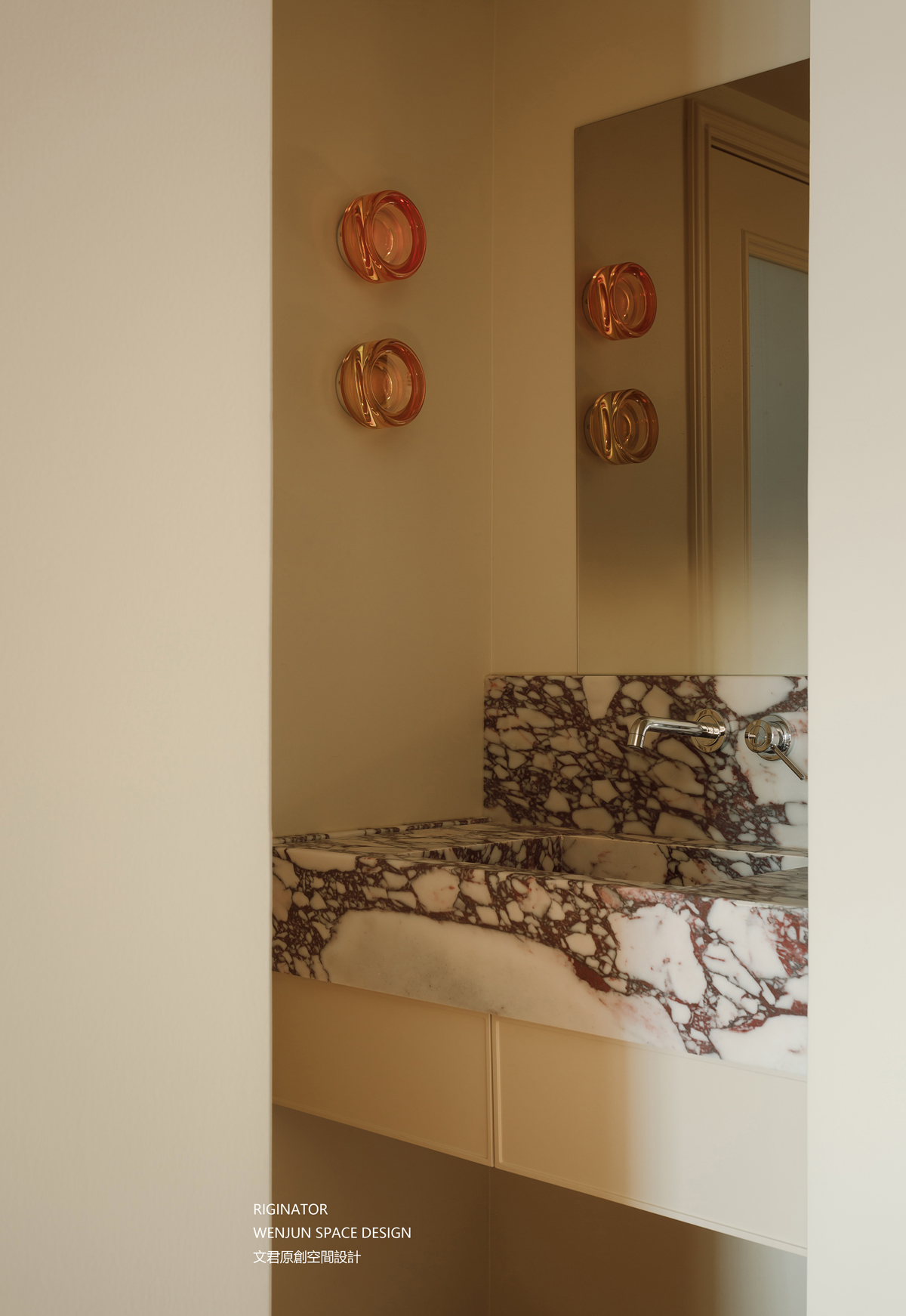 卫生间选用奶白色墙体,一体化置物架“隐身”其中。洗手池靠近玄关,方便进出清洁。采用宝格丽石材一体盆,营造风格的差异性,反而搭配了设计风格。将就的是平凡,讲究的设计。