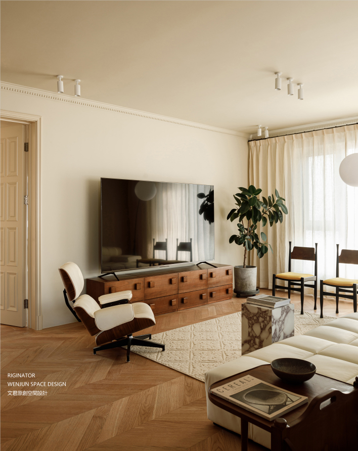 简约木椅、轻法式沙发、可分离躺椅、宝格丽石材装饰,中古风+轻法式细节点缀的客厅,温柔与品质呼之欲出。