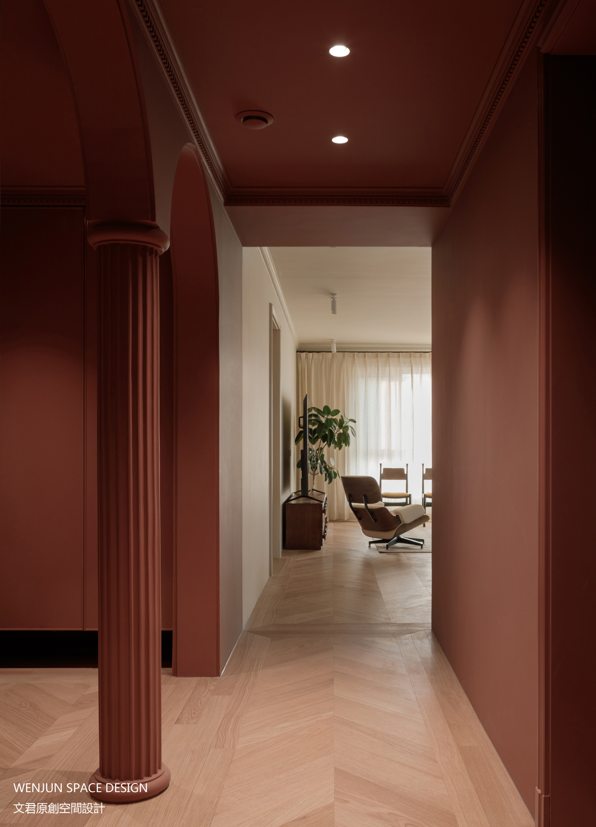 不同的色彩可以带给人不同的感受,甚至可以引起心境的变化。我们在玄关处,整体刷上赢红色漆,营造强烈的视觉感受,并用色彩明暗将玄关区域独立出来。推开房门内敛优雅的复古感亦扑面而来。