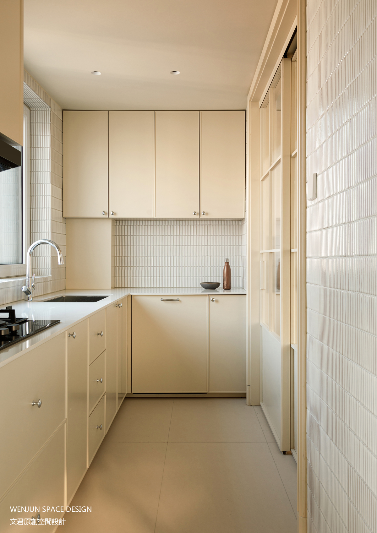 客厅西侧区域是中西厨一体,用长虹玻璃门封闭原有厨房作为中厨,采光层次感增强,也可避免油烟侵扰。
