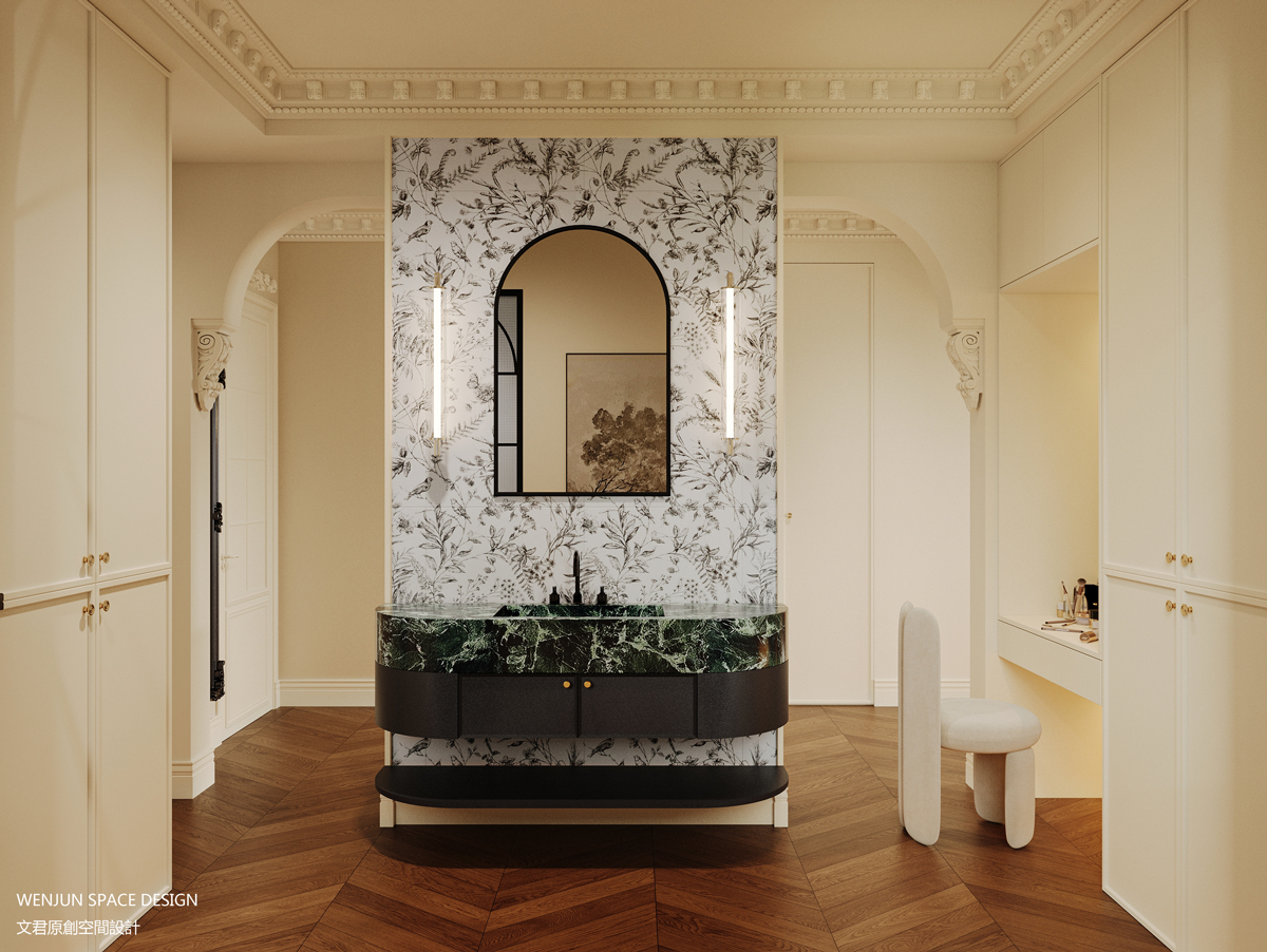 以复古造型墙体作为动线环绕的基石,设立Prada绿轻奢洗手台,四周环绕的是隐藏式双开门衣帽间,让盥洗和穿衣造型都可以在一个空间内完成。