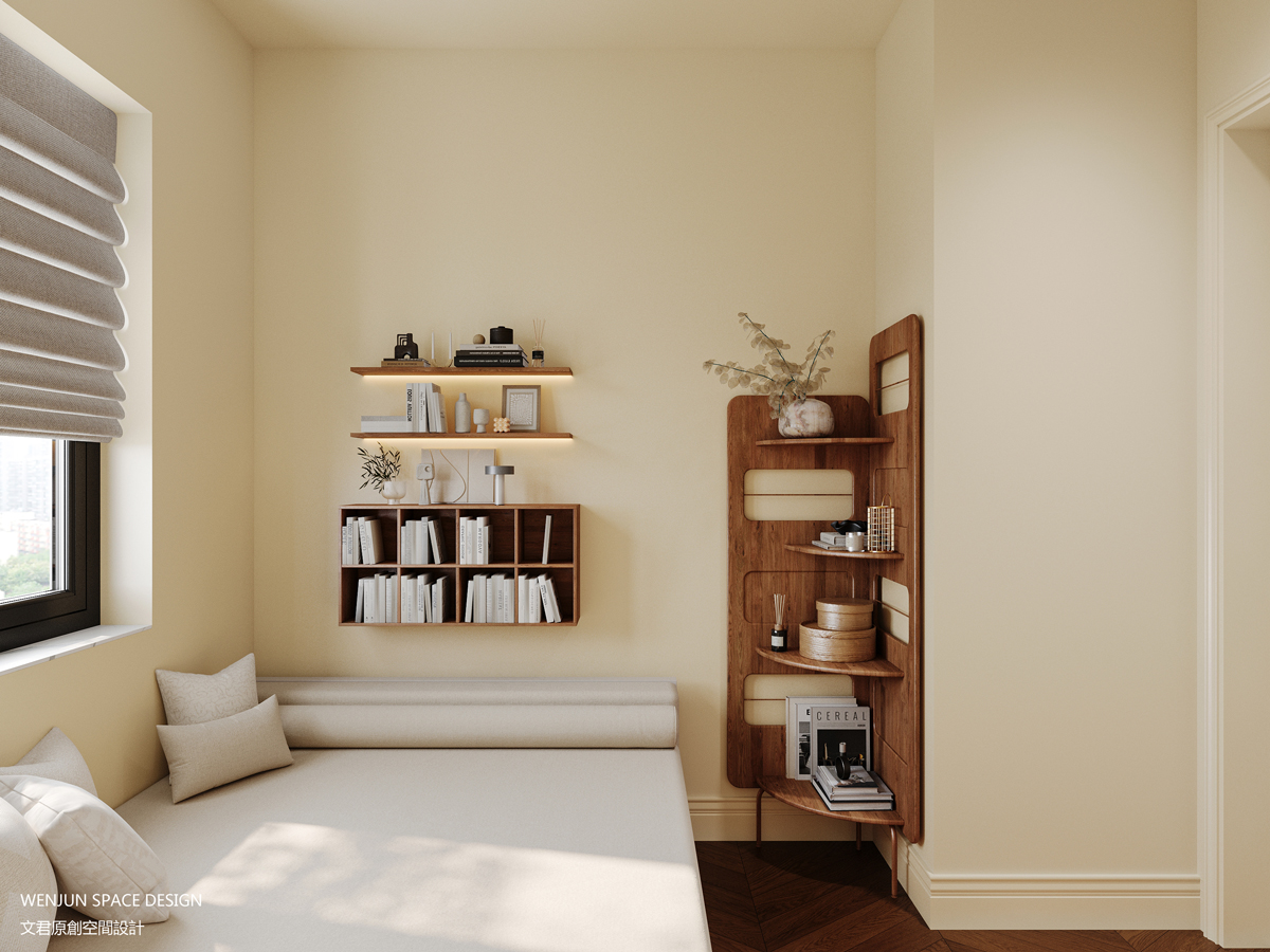 次卧室床体设计成了卧榻,加上柚色隔板式书架与木制的收纳架,简约又实用。