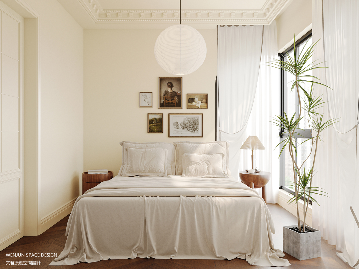 主卧室以低饱和度的配色为主,背景墙用艺术感挂画装饰,把柔和的空间变的更加饱满。