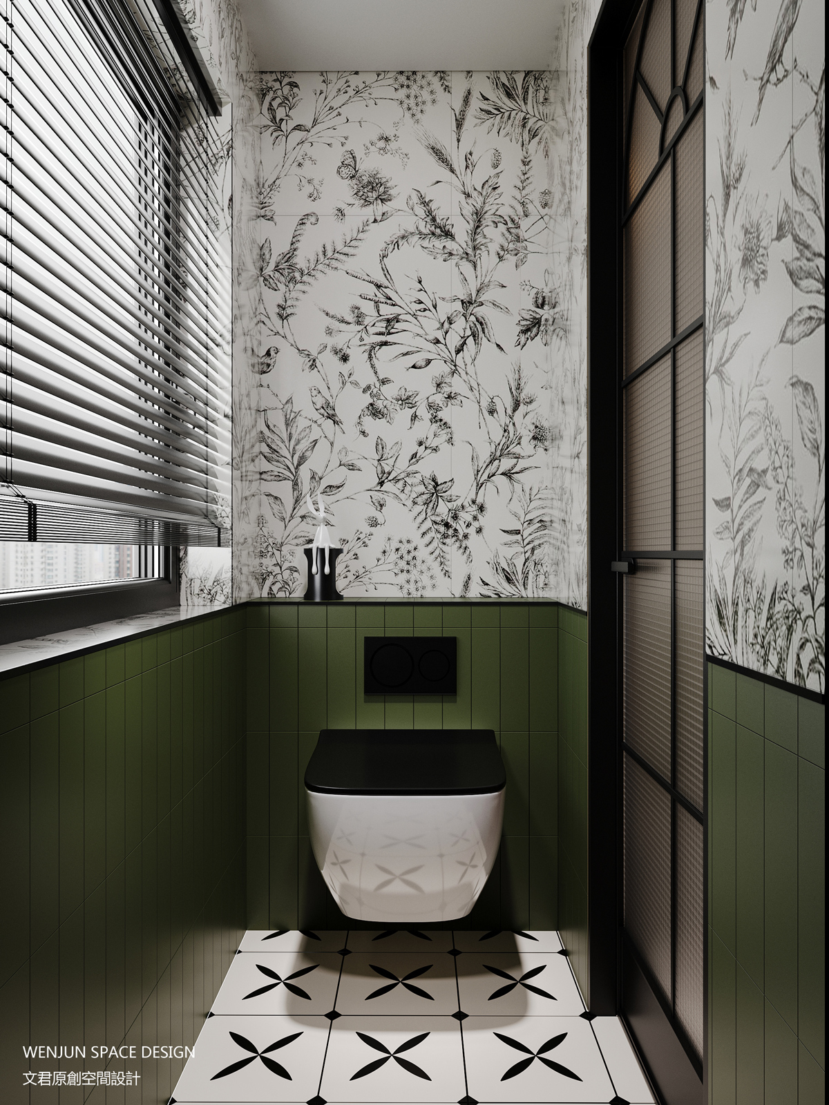 洗手间内部融合花纹墙布、墨绿色墙砖和地砖,再次提升质感。