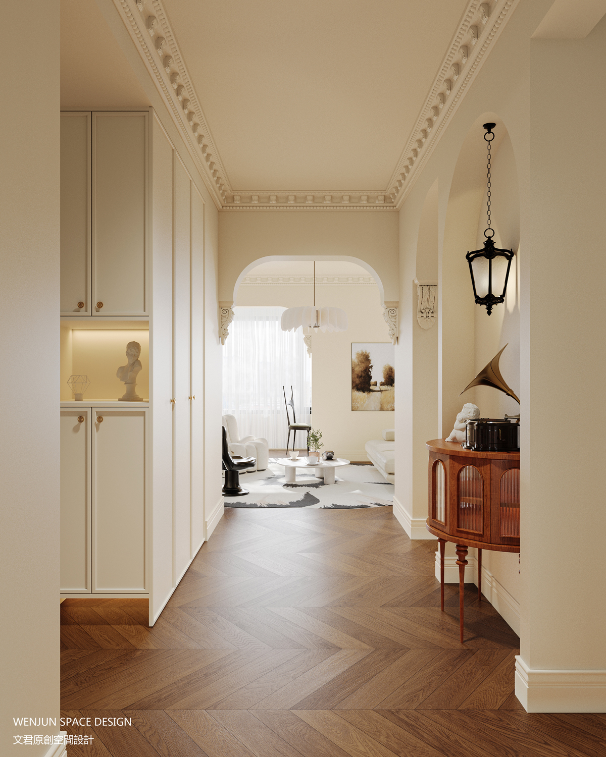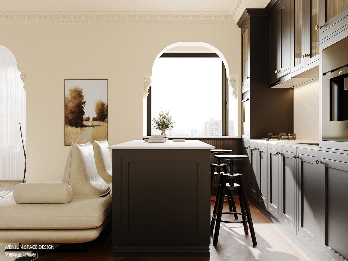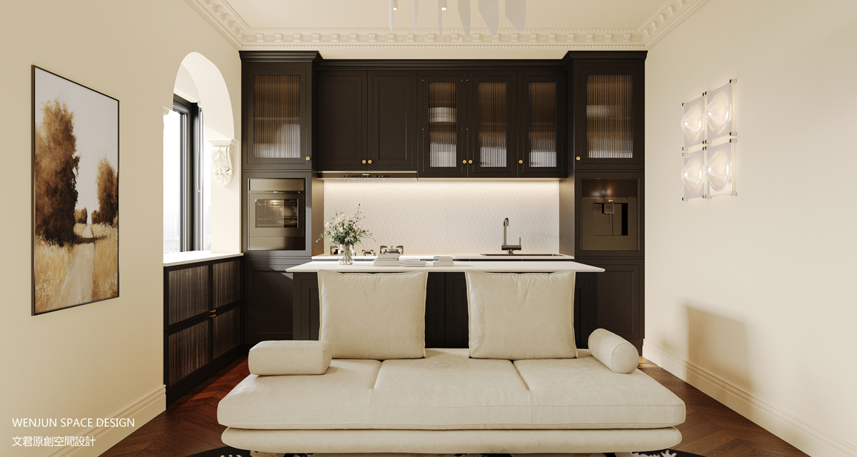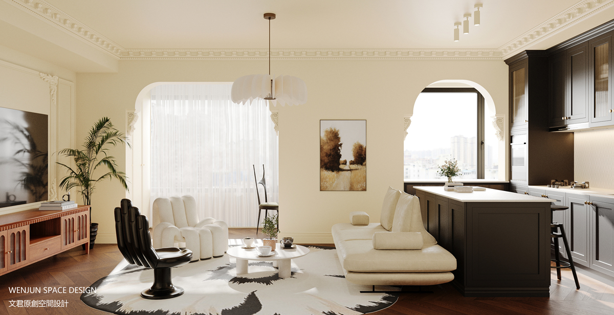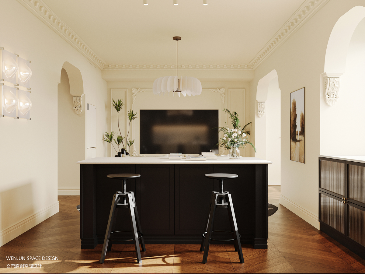 在正对户门的位置,我们做了一扇拱形凹龛形式的端景墙,将中古摆台及个性单品巧妙的嵌入其中。而对称的弧形垭口设计,与端景墙完美融合,实现了空间的功能性和美学上的统一。