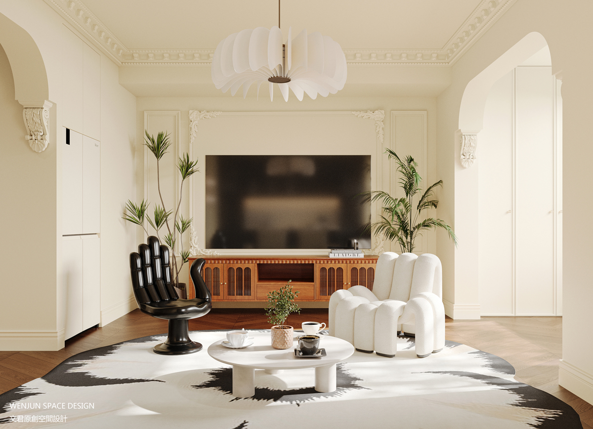 用极简的法式线调装饰墙面,加以绿植点缀,呼应真皮沙发搭配手指造型椅,整个空间舒适程度与趣味感都得到提升。