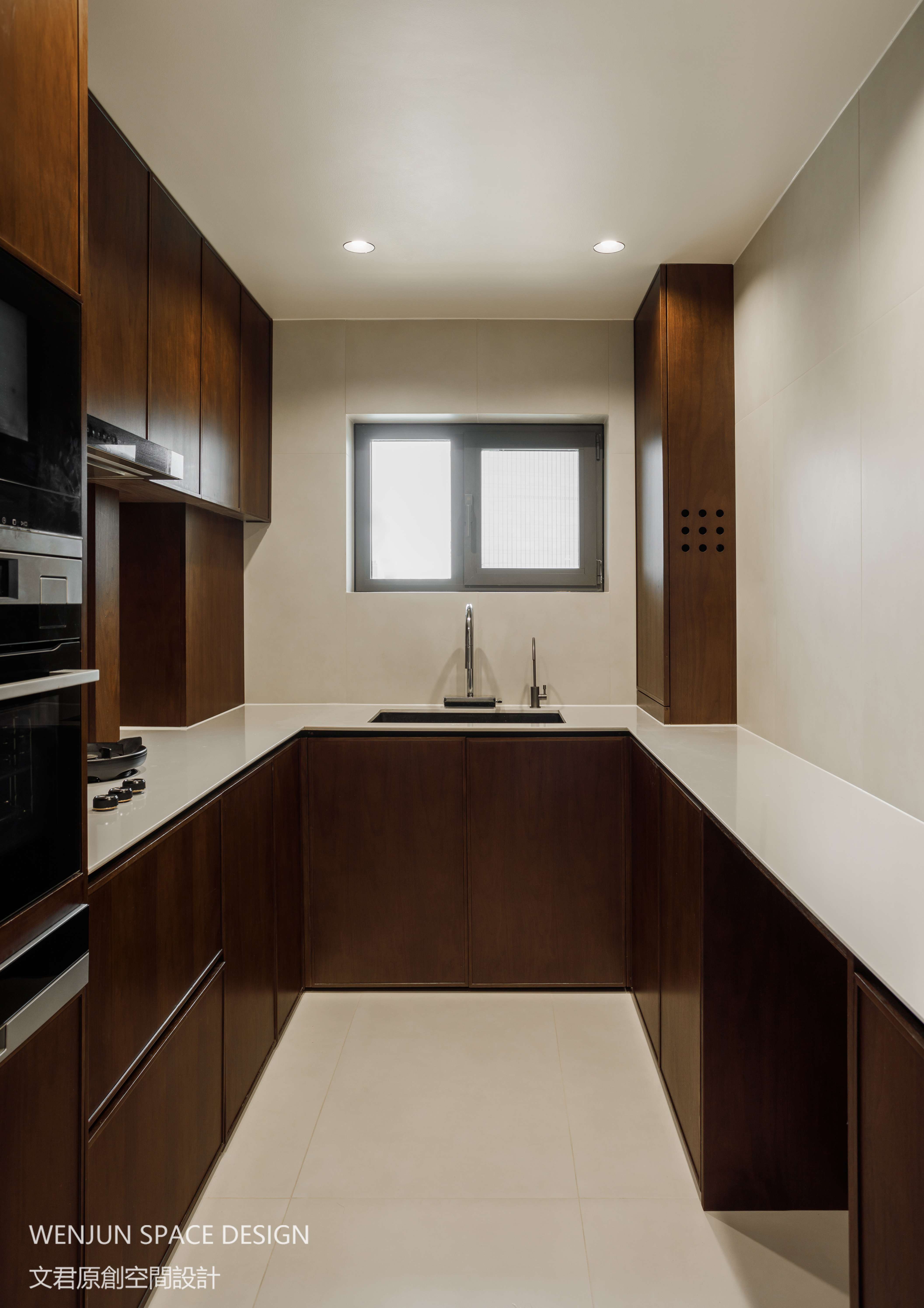 中厨做了U型台面处理,最大程度利用空间的每一个角落,让操作、储藏、烹饪区域一个转身之间就可以快速切换。完全能容纳夫妻二人同时操作。