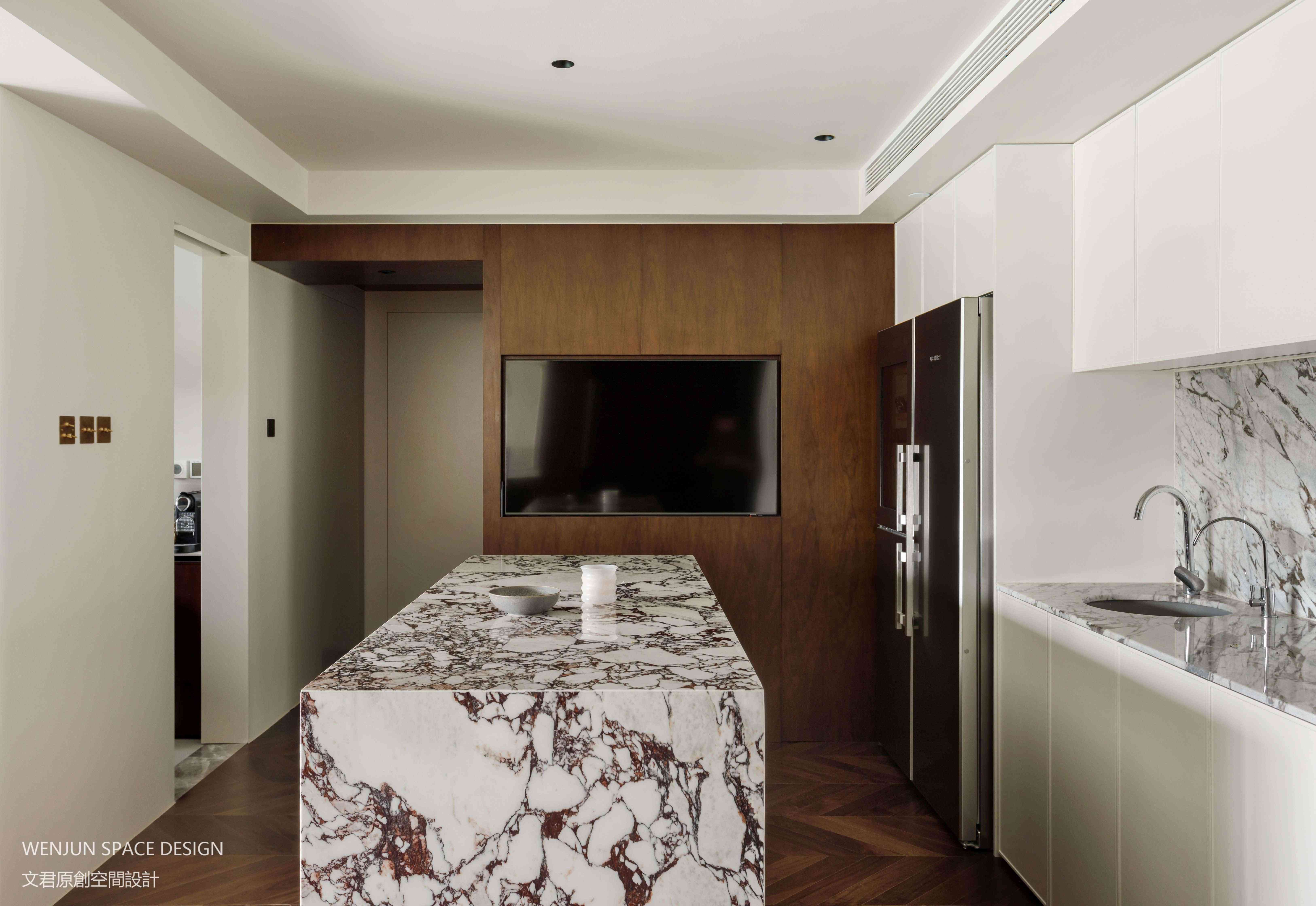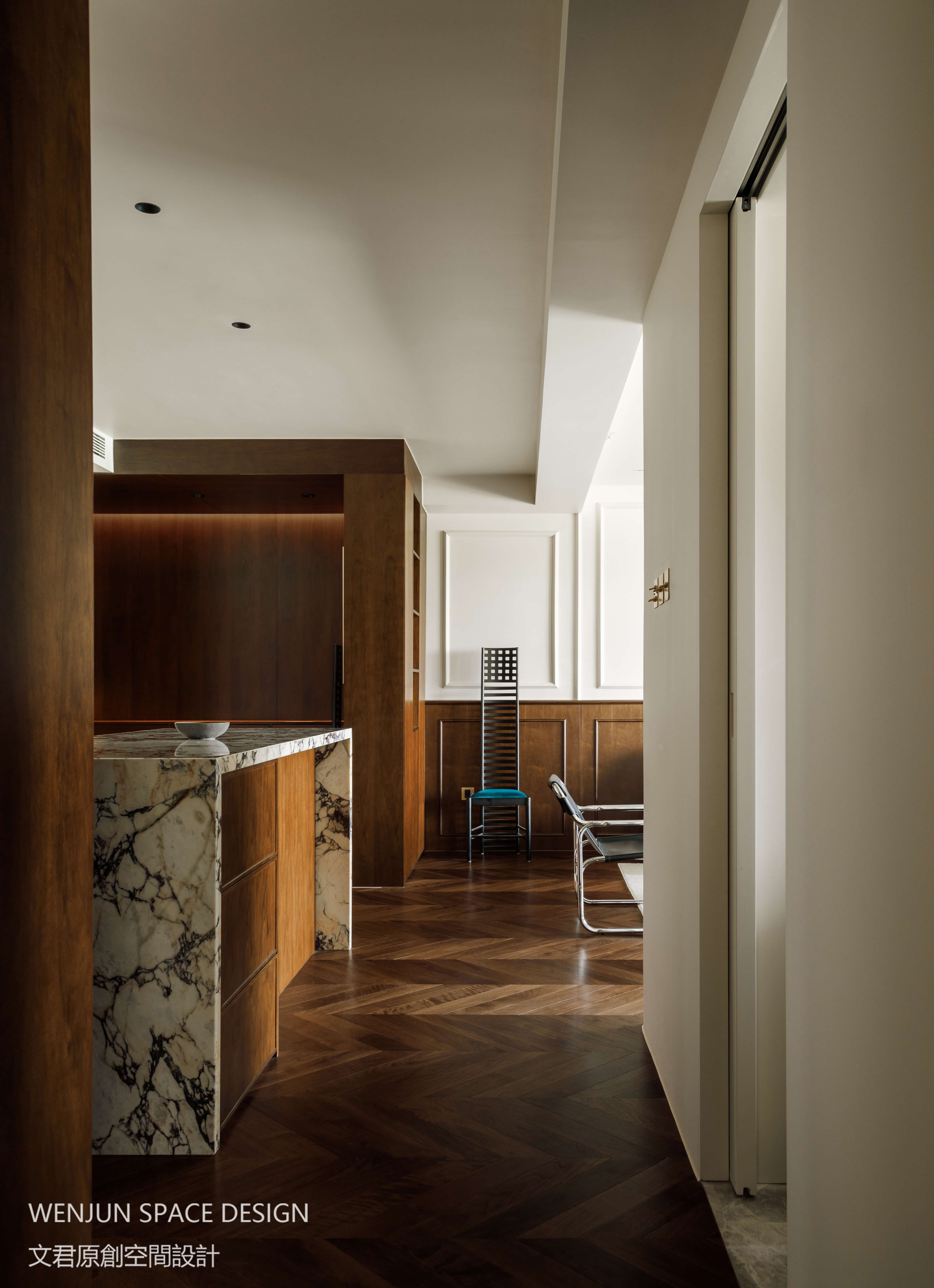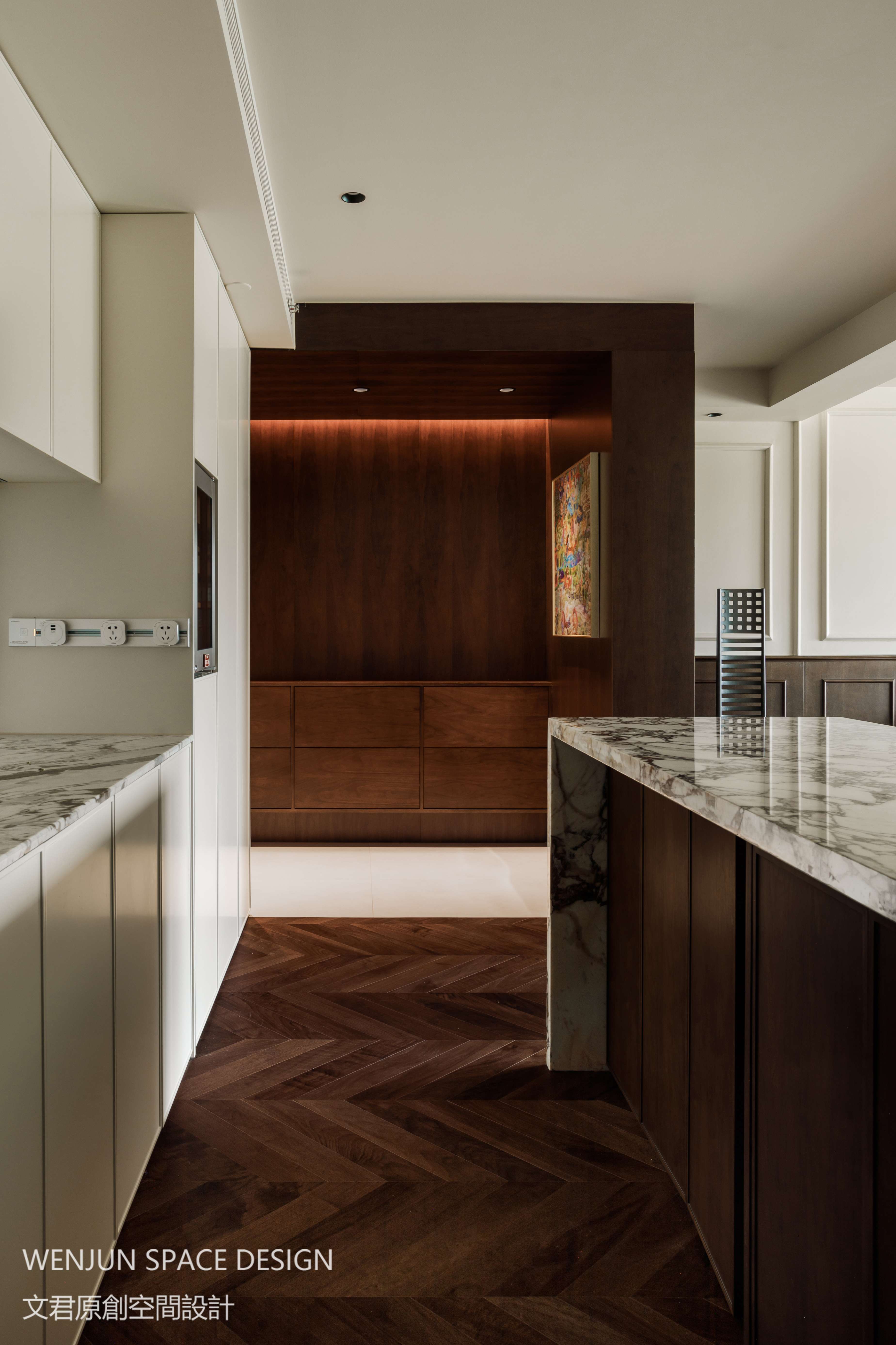 西厨长的操作台与中岛台结合让空间的尺度进一步加大,充满了仪式感。不论是备餐、磨咖啡、还是用餐,都成为二人世界情感交流的浪漫之地。