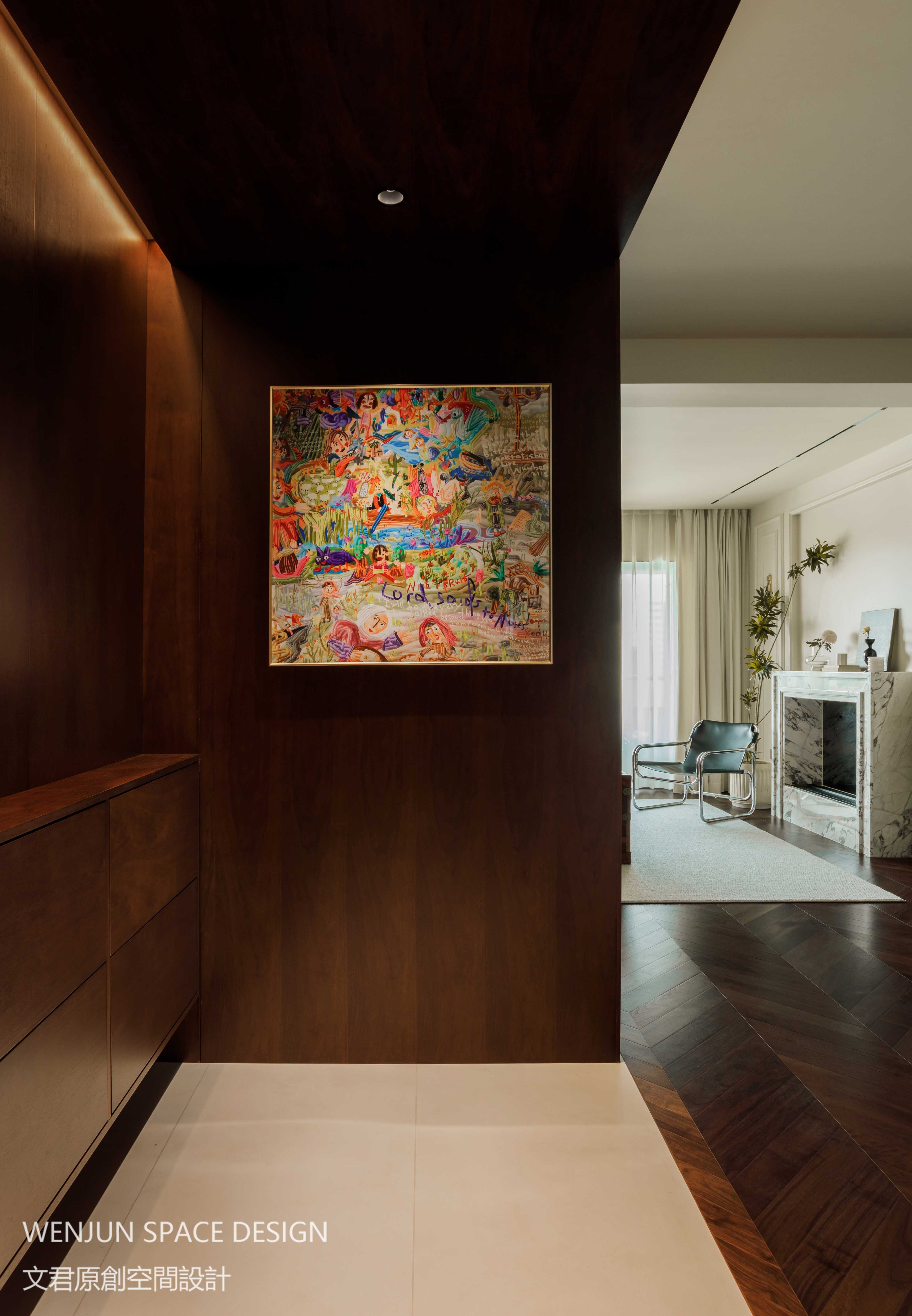 玄关色调采用深胡桃色,搭配无主灯设计,挂上业主喜爱的挂画,小小的空间不仅实用,而且生动、有趣。