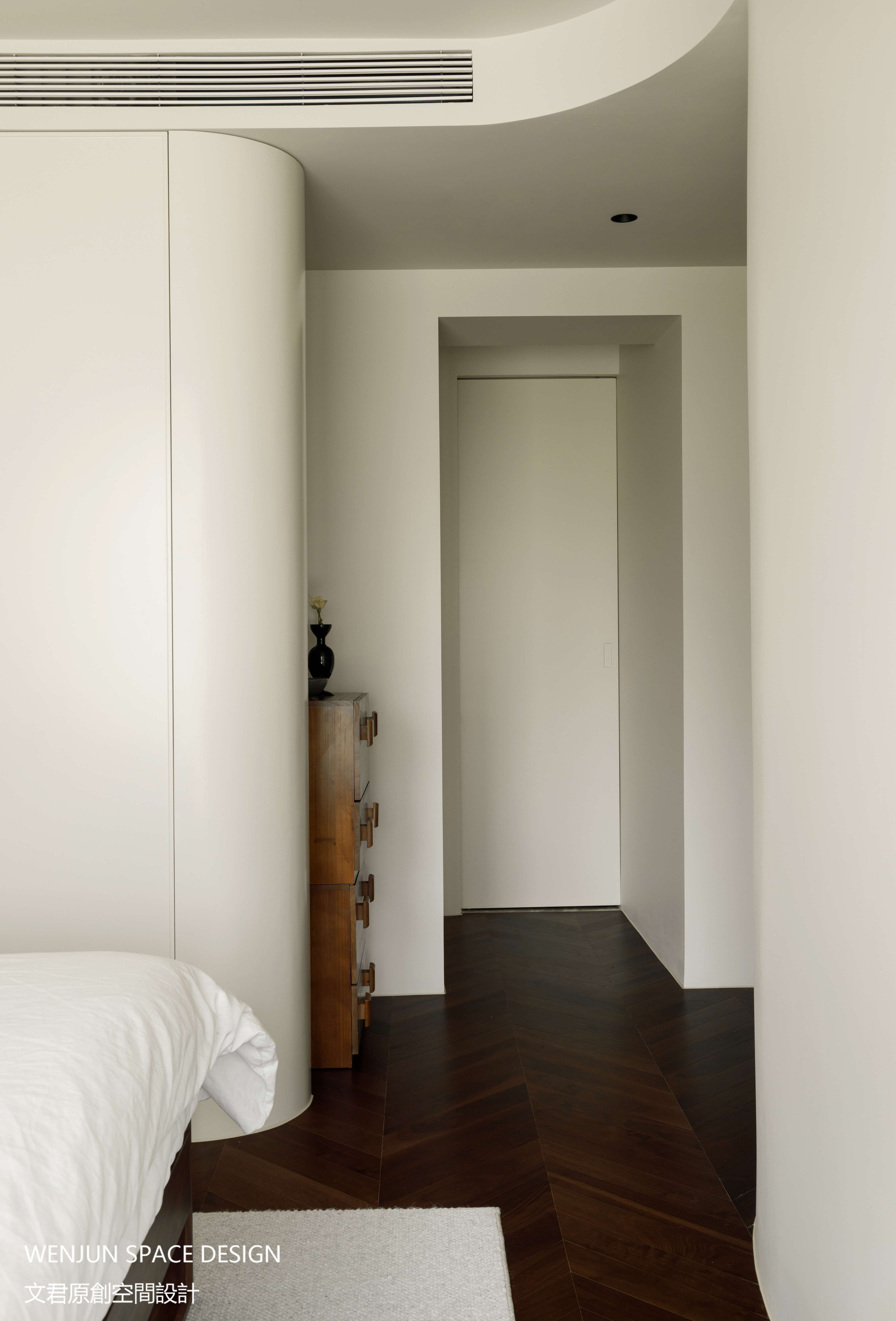 床头右侧衣柜采用隐藏式设计,完美与卧室墙体融合为一体。在转角处用了纵深感的弧面处理,借助曲线和厚度增强仪式感,兼具收纳实用性。