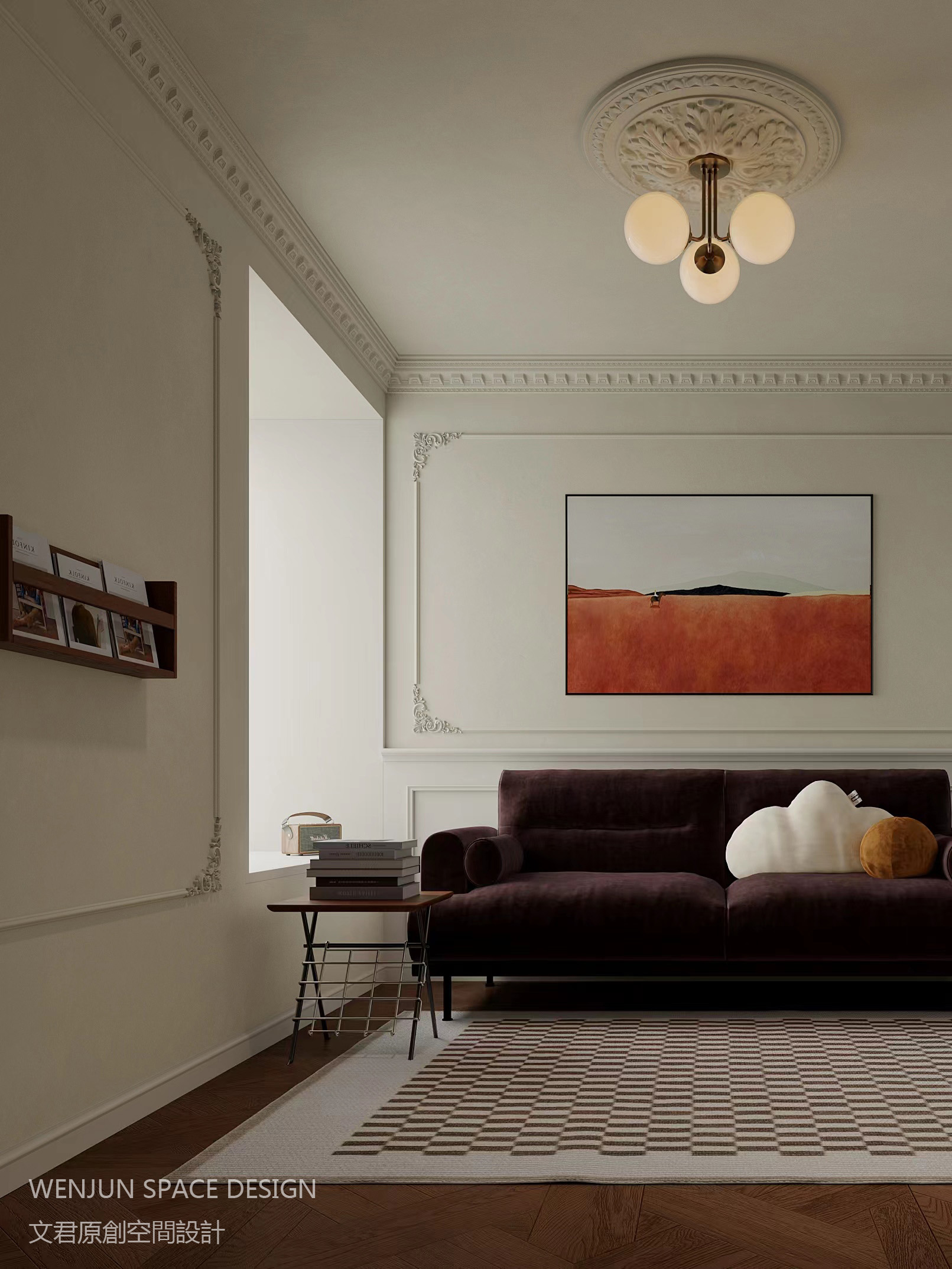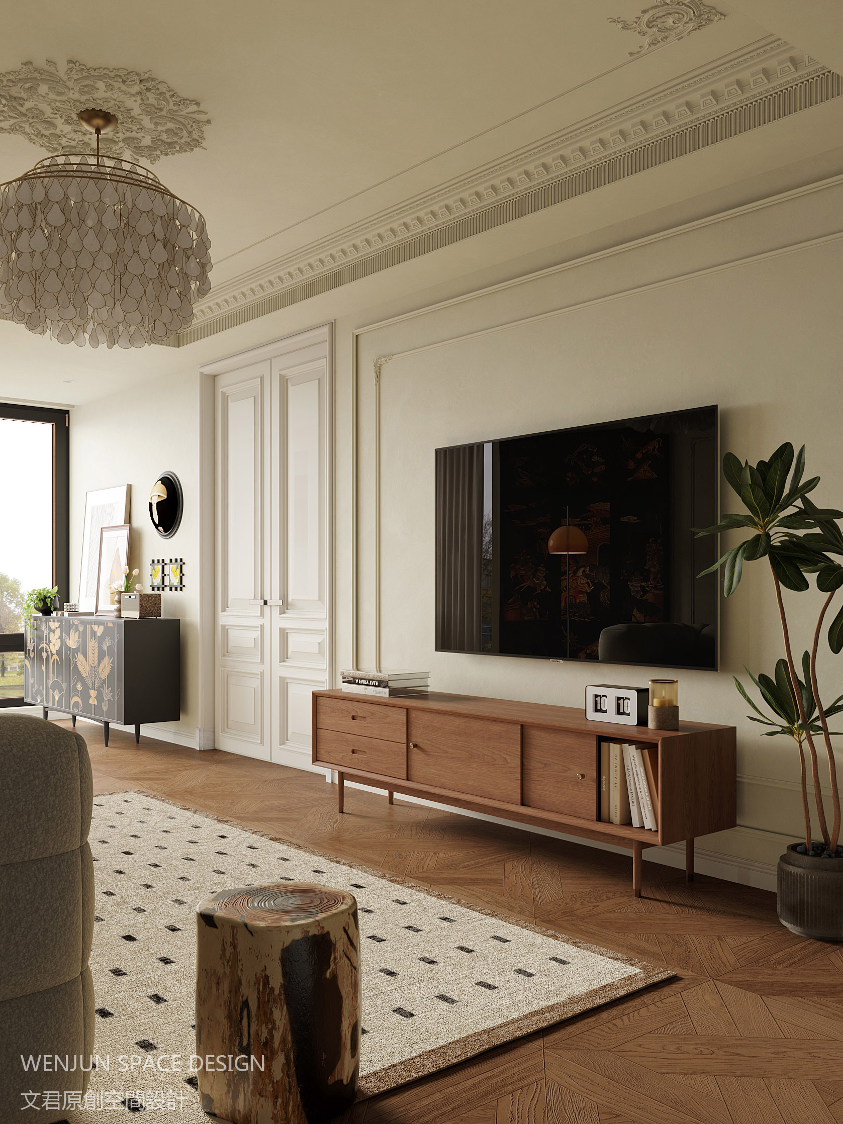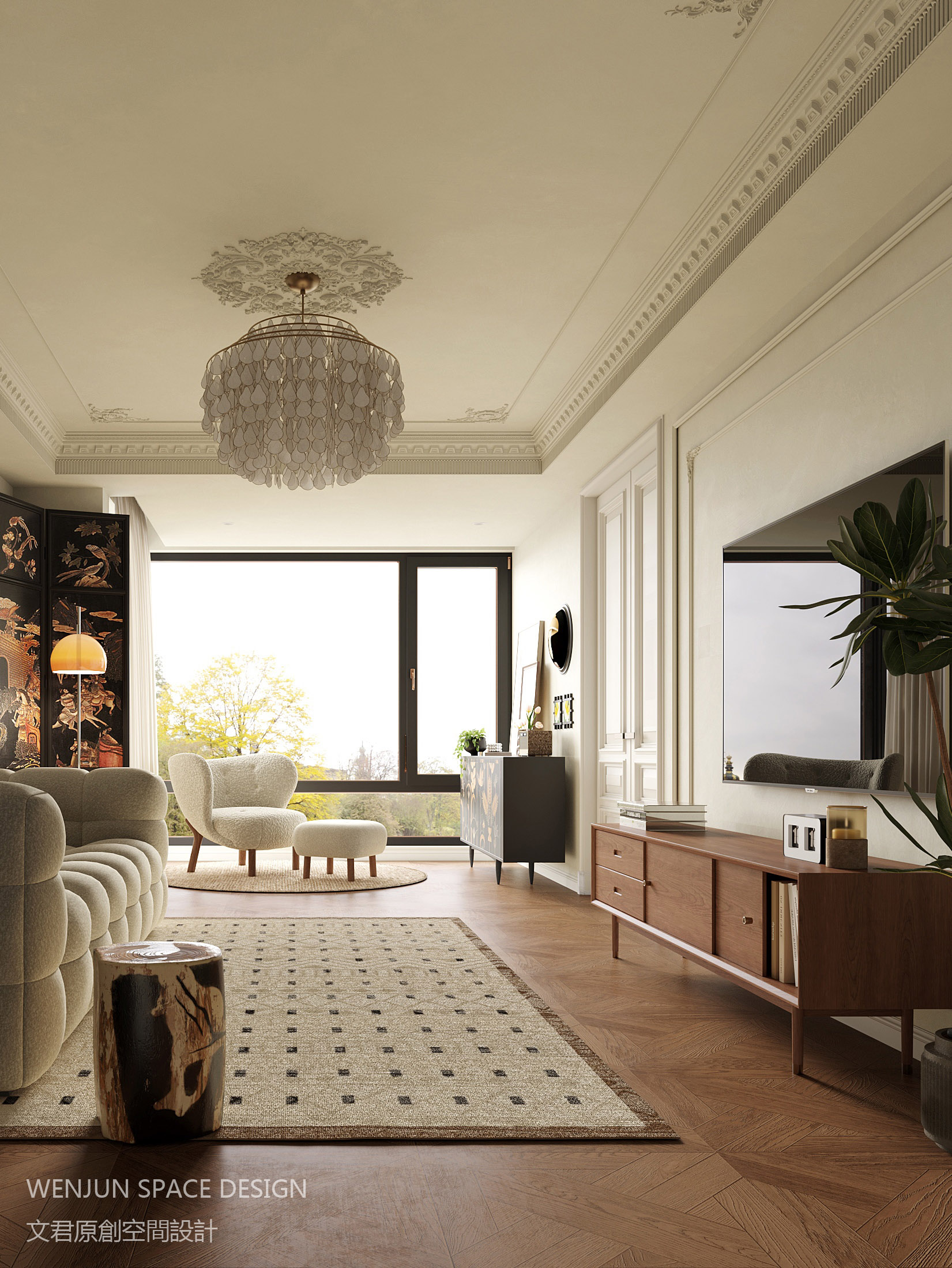 全屋以奶油色为主,搭配胡桃木拼纹地板、羊毛沙发、中式屏风以及宽叶绿植,整屋散发着一种古典而优雅的复古气息,混搭的风格带入家中的每个角落。