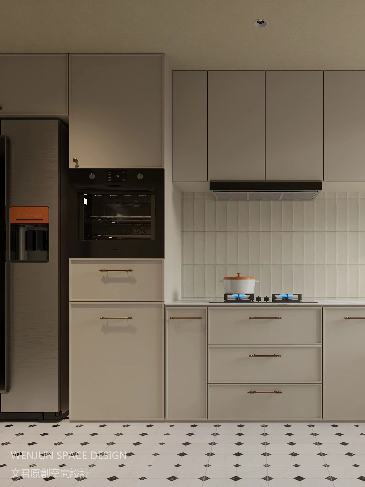 厨房和玄关处使用的黑白跳格花砖,与客厅的黑白格地毯相呼应,整个空间和而不同。