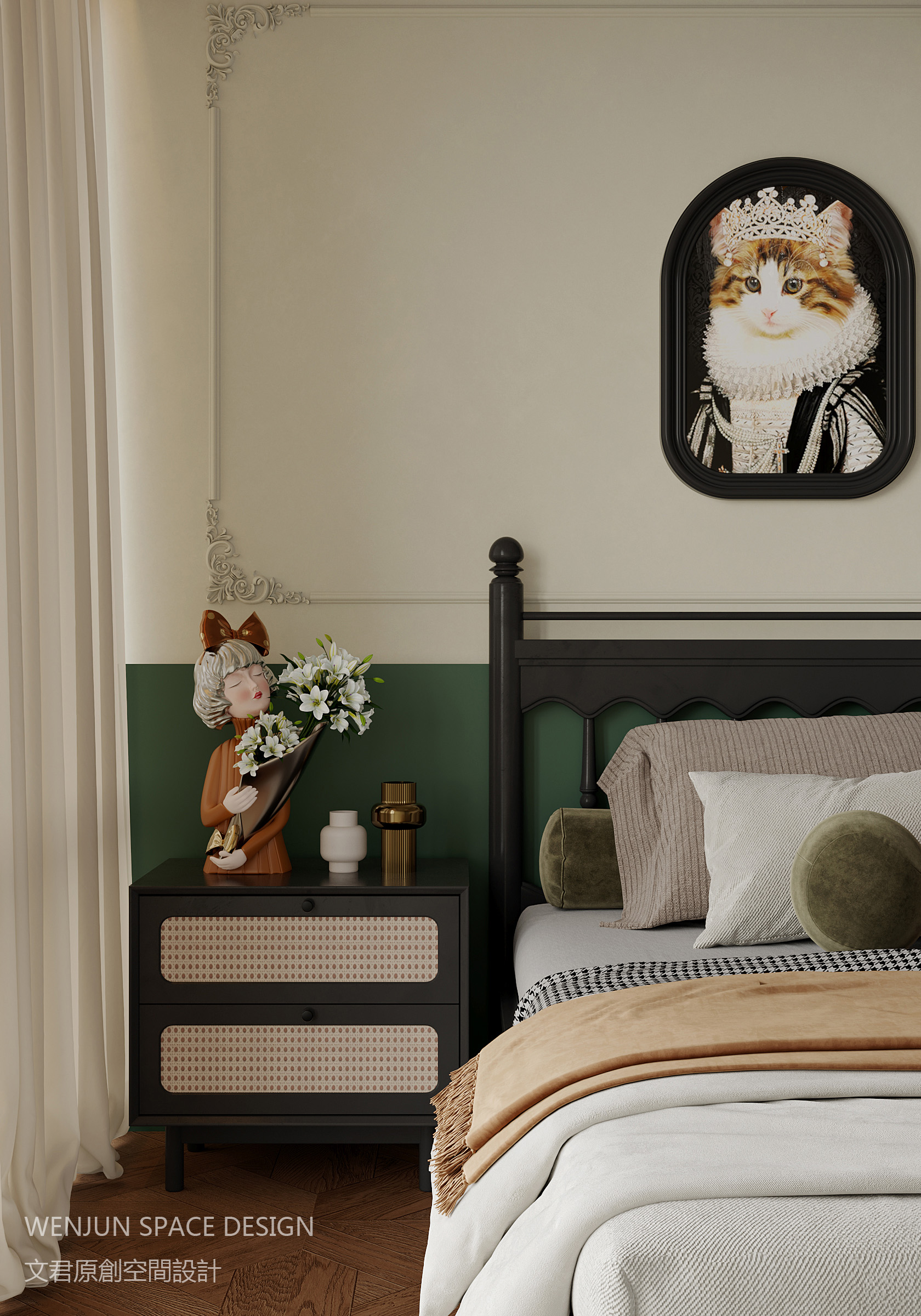 法式雕花,叠合墨绿色的床头背景,营造出了南洋混搭法式复古元素的魅力。