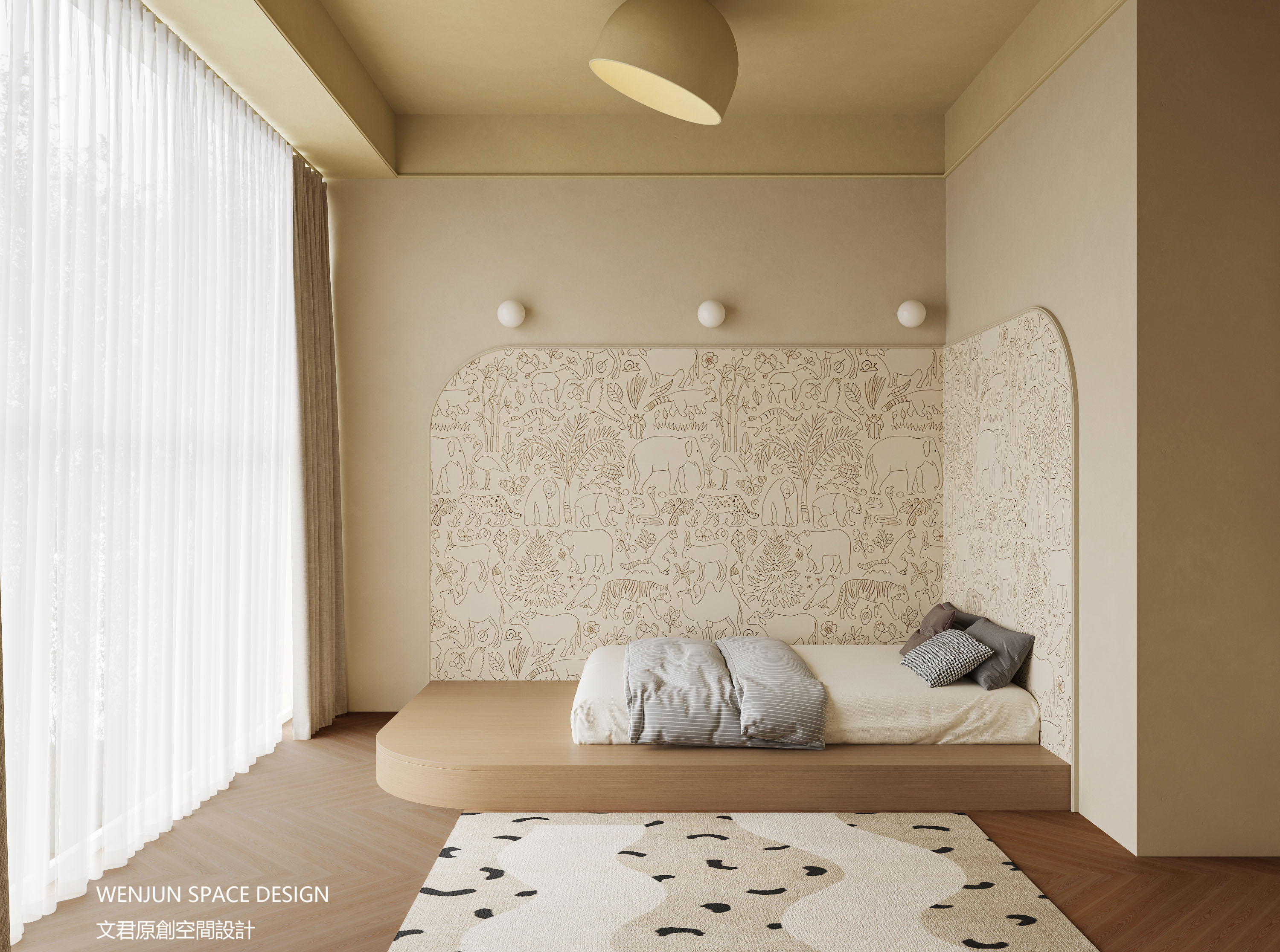 儿童房使用地板床的适龄化设计,搭配富有童趣的壁画和地毯,温馨可爱。