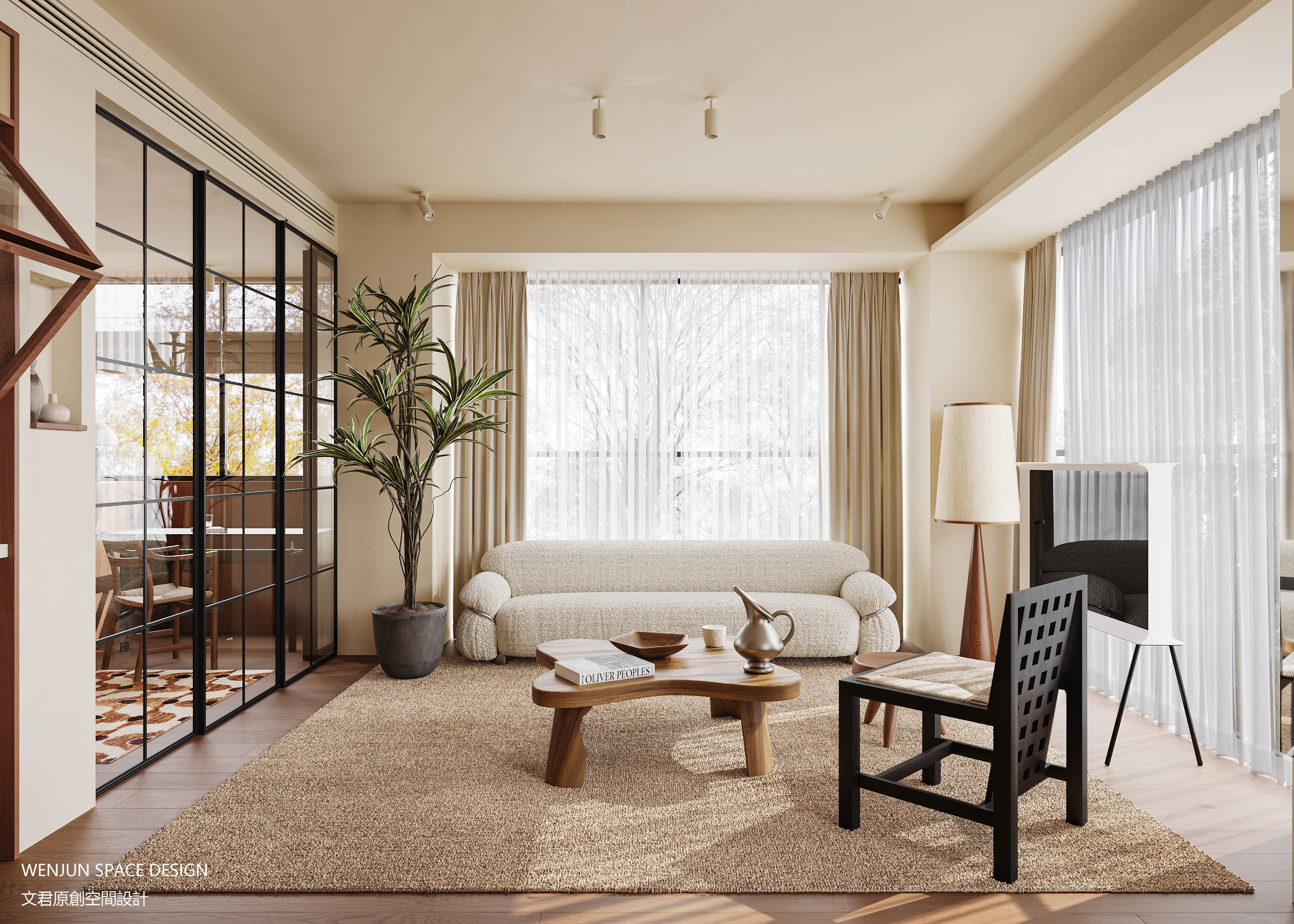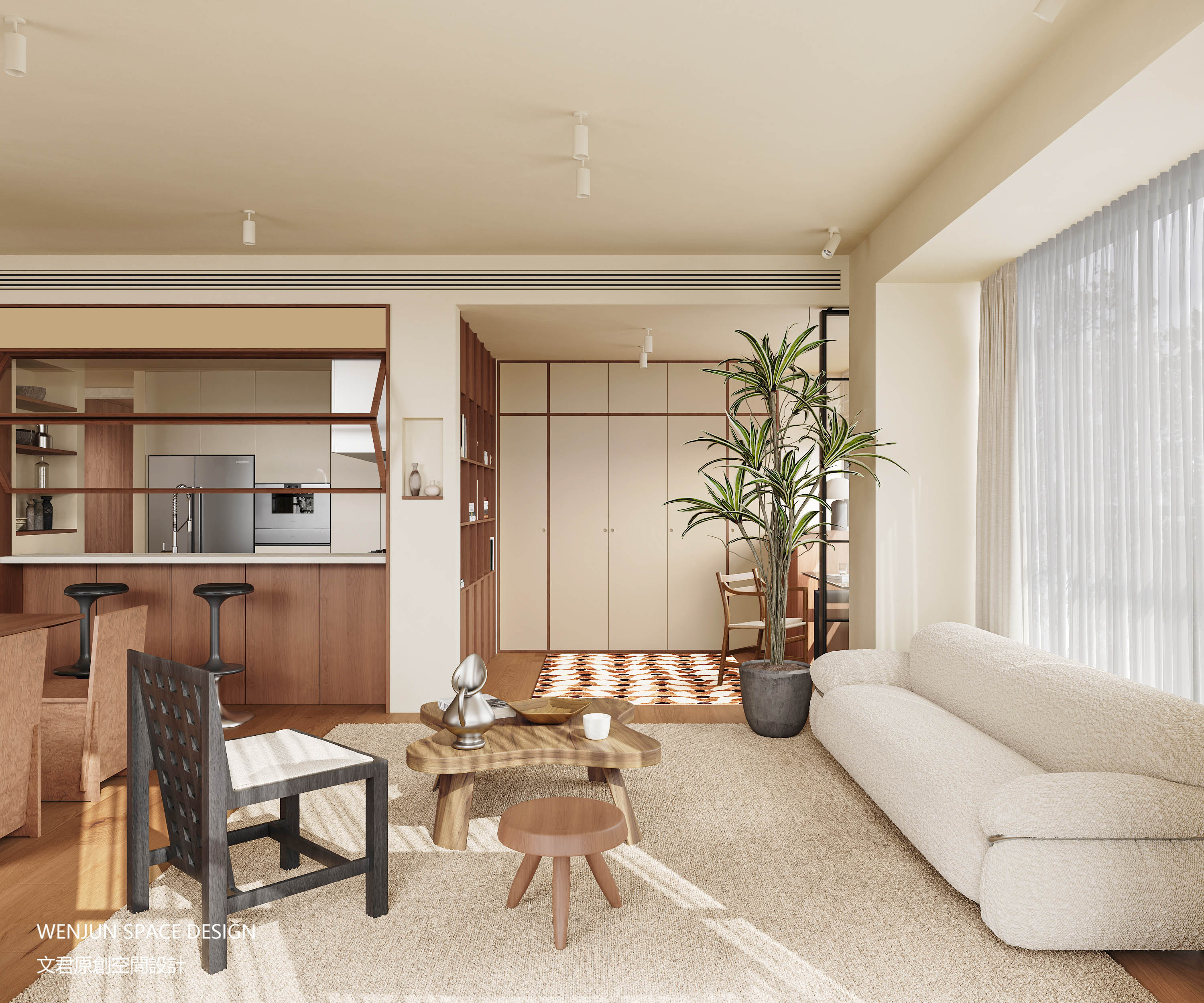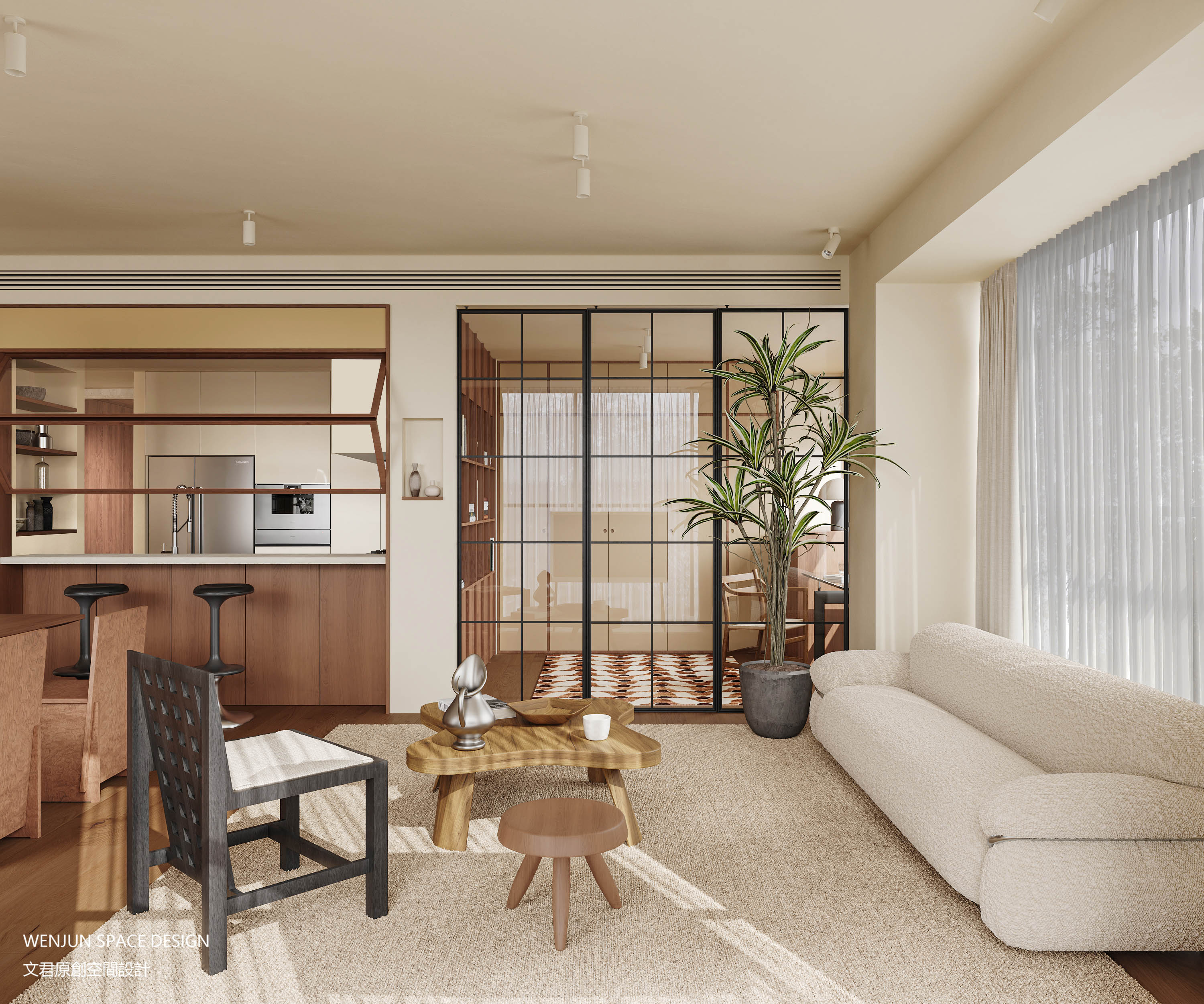 本案以奶油基调为主体,整体搭配胡桃木色沉淀出心有所归的栖居感,黑色用来局部点缀,低调高级。
