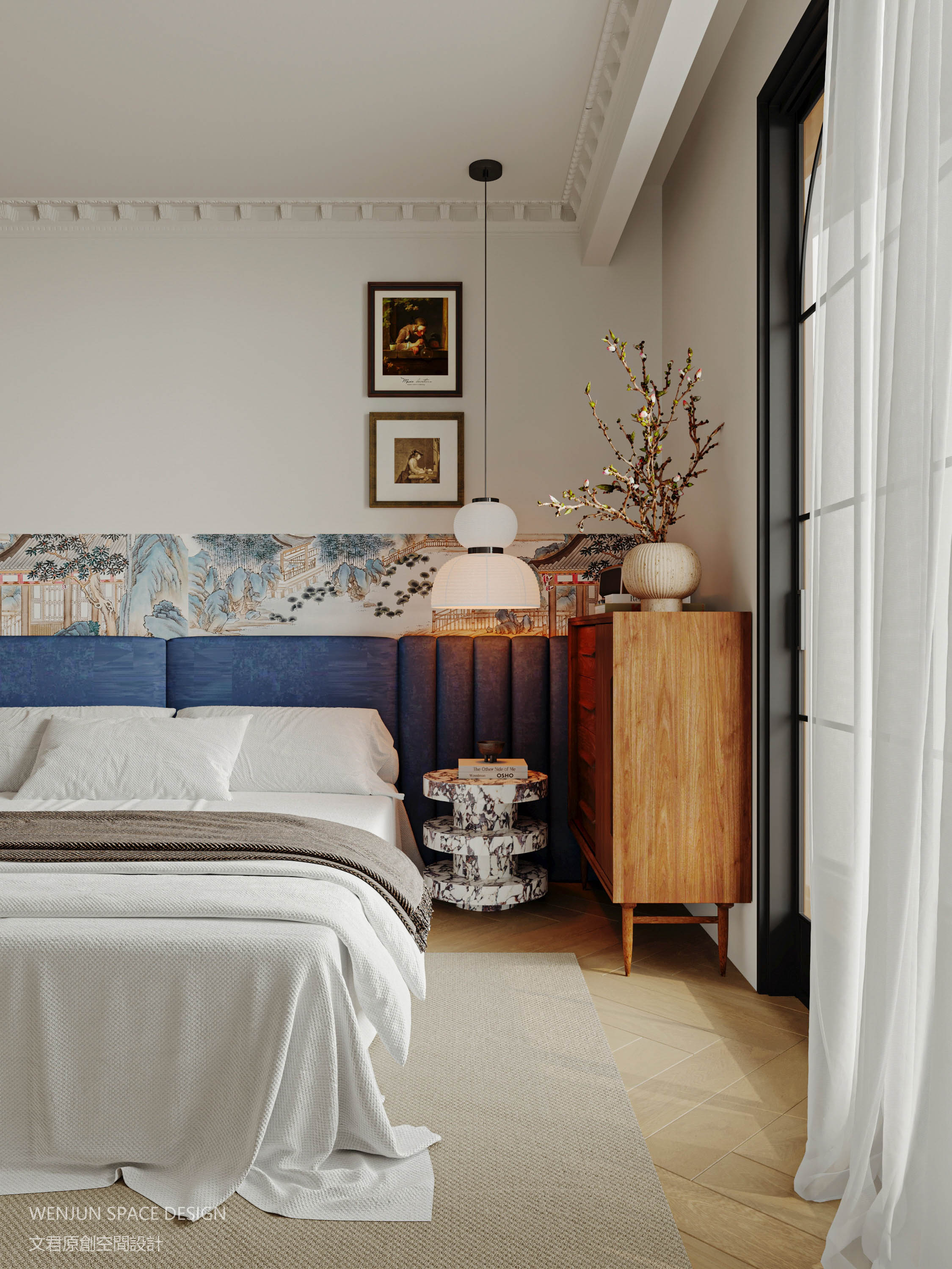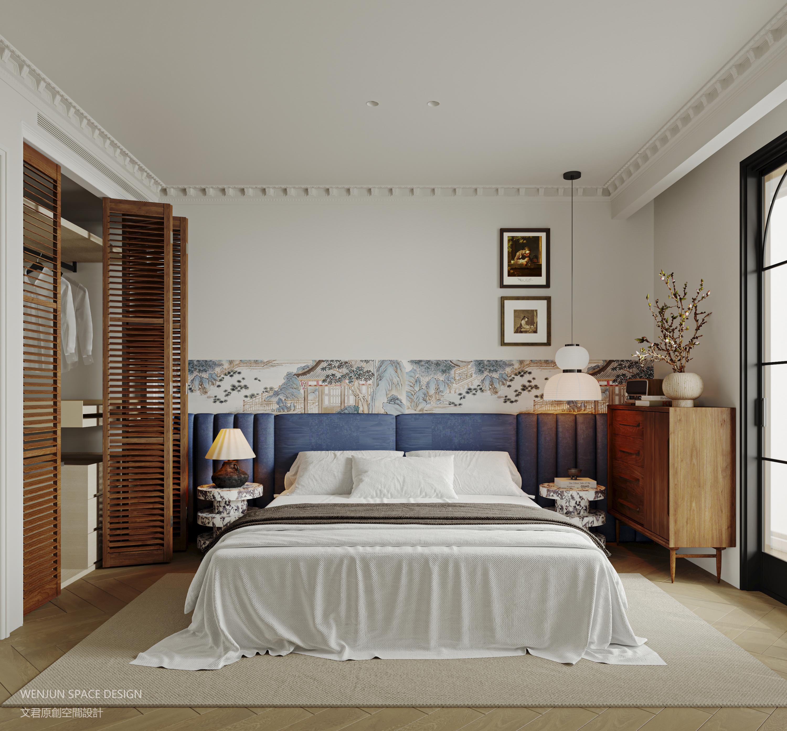 中式背景墙、青黛色软包床头、中古斗柜、百叶复古衣橱、亚麻地毯,细节感拉满,句句不提法式中国化,但整体说得明明白白。