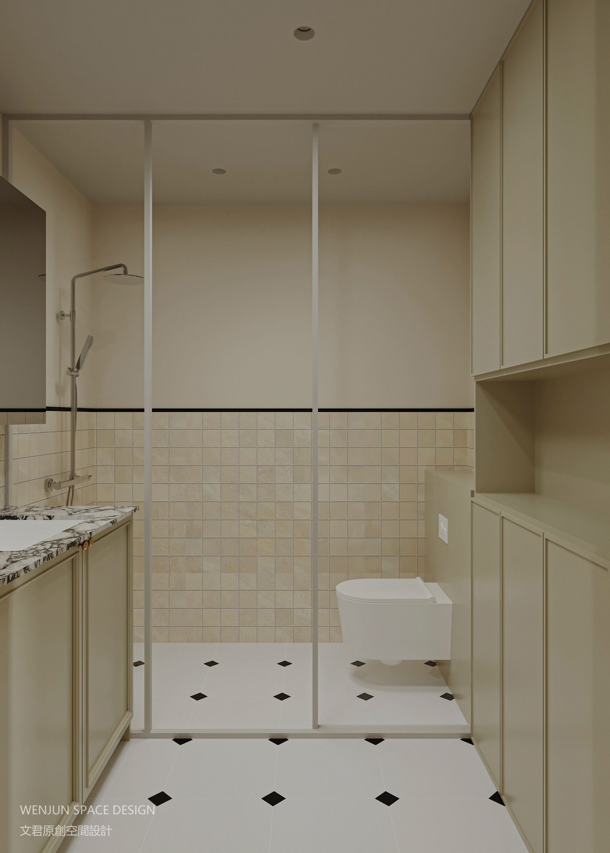 是用大面积黄润色,搭配黑白格地砖和全屋统一的大理石,打造出舒适又典雅的环境。