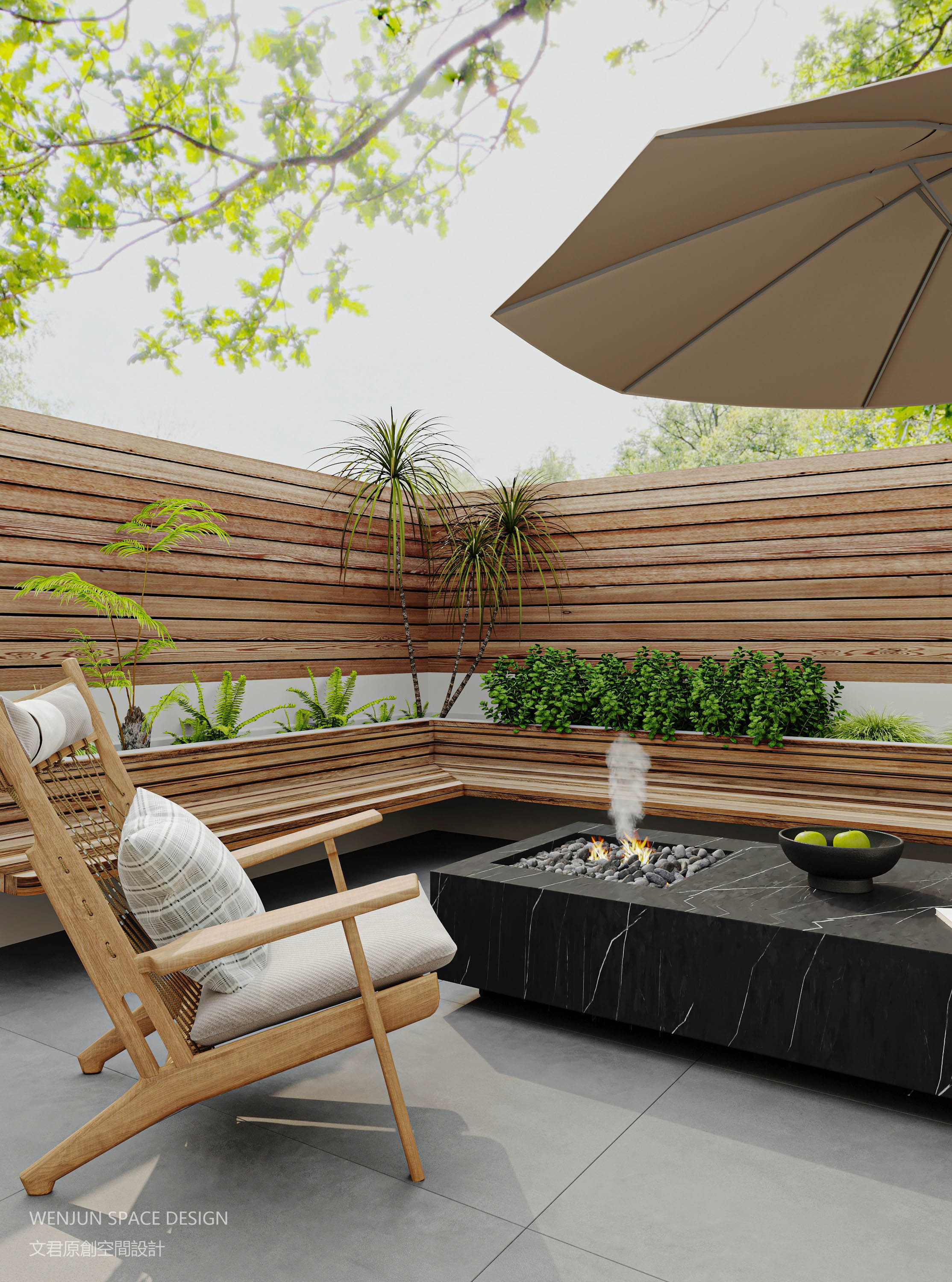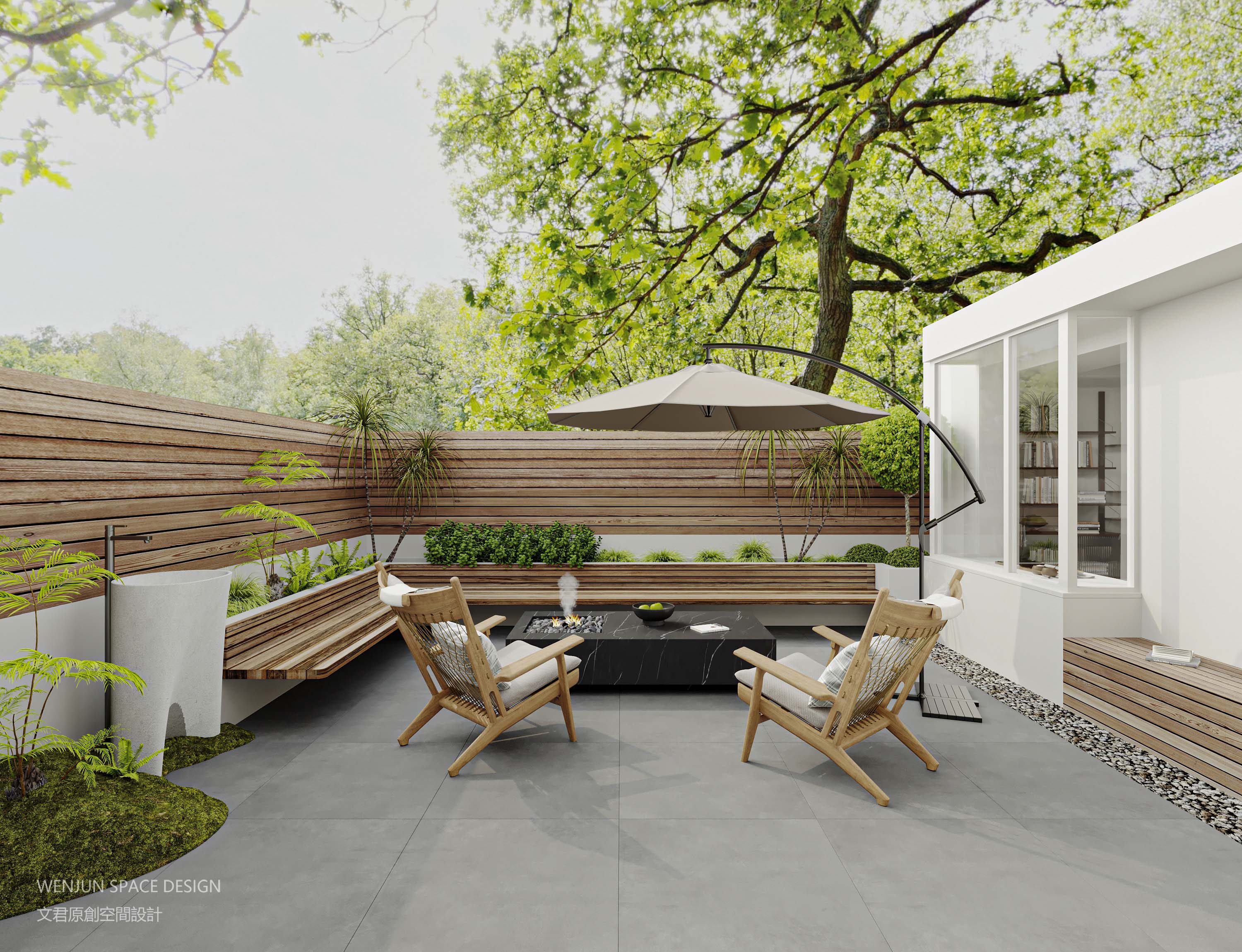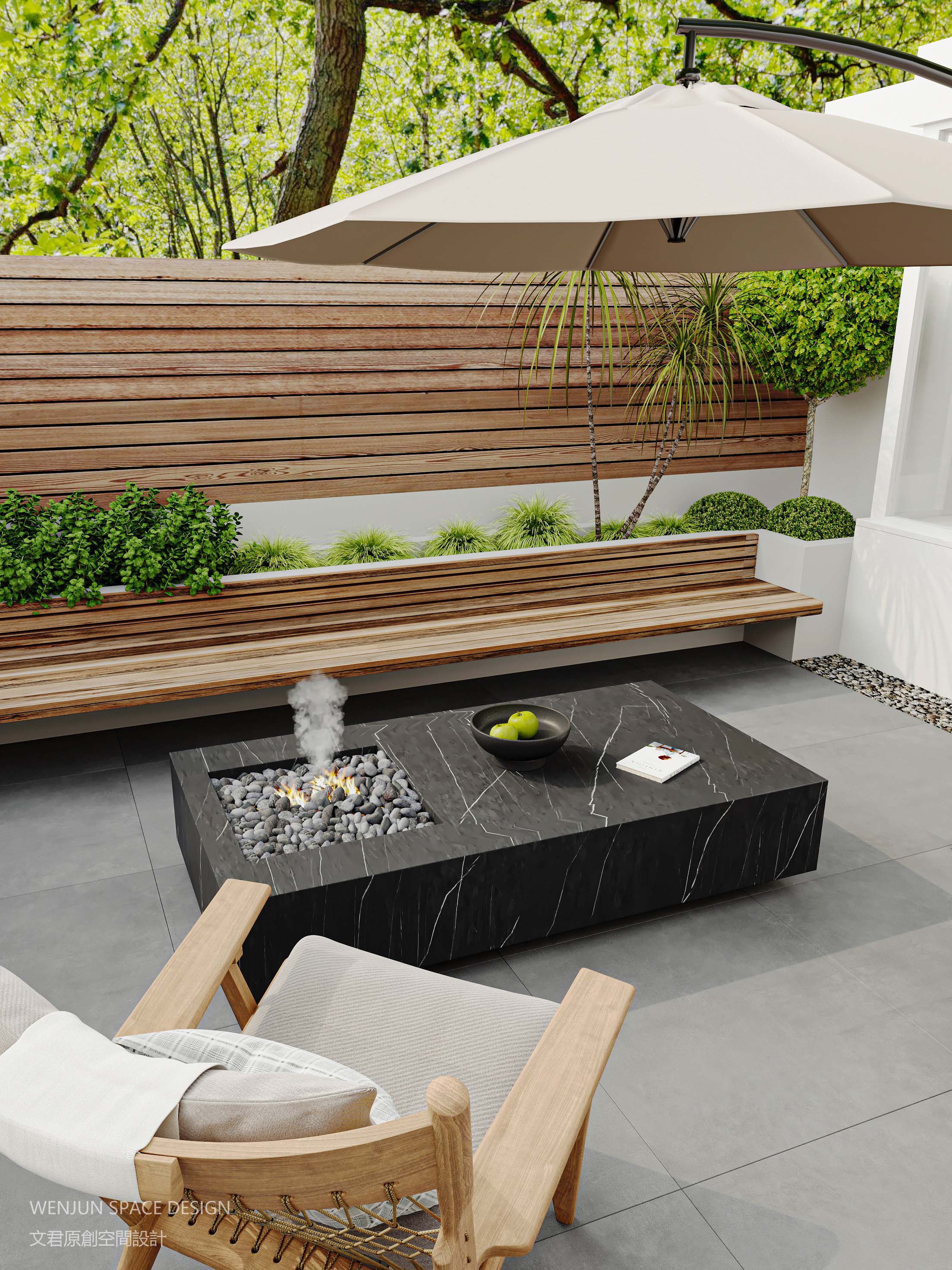 半围合设计的庭院空间,采用原木和黑色大理石两种材料为主要元素。