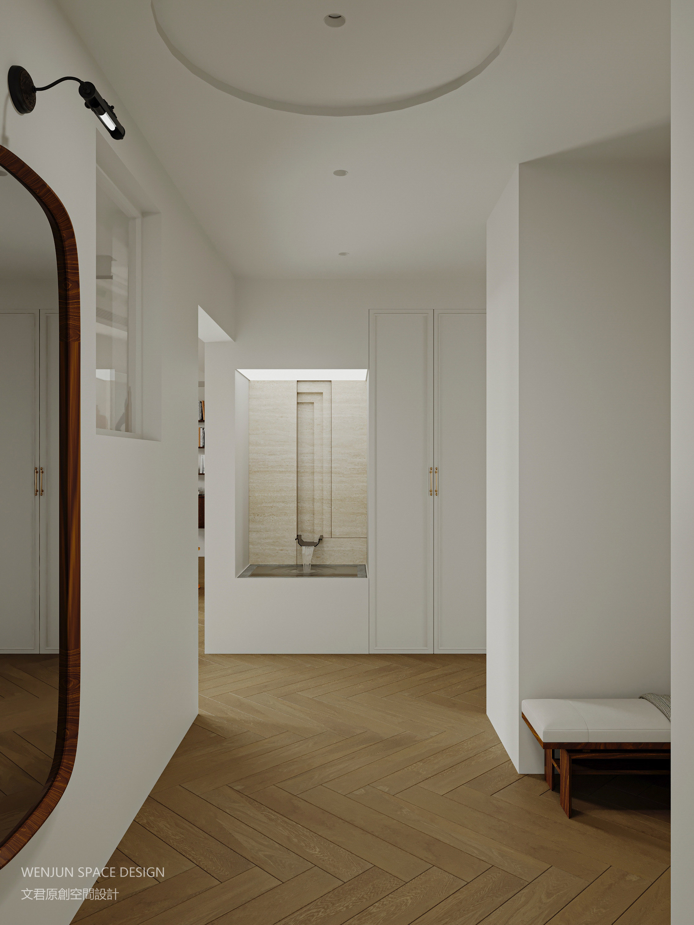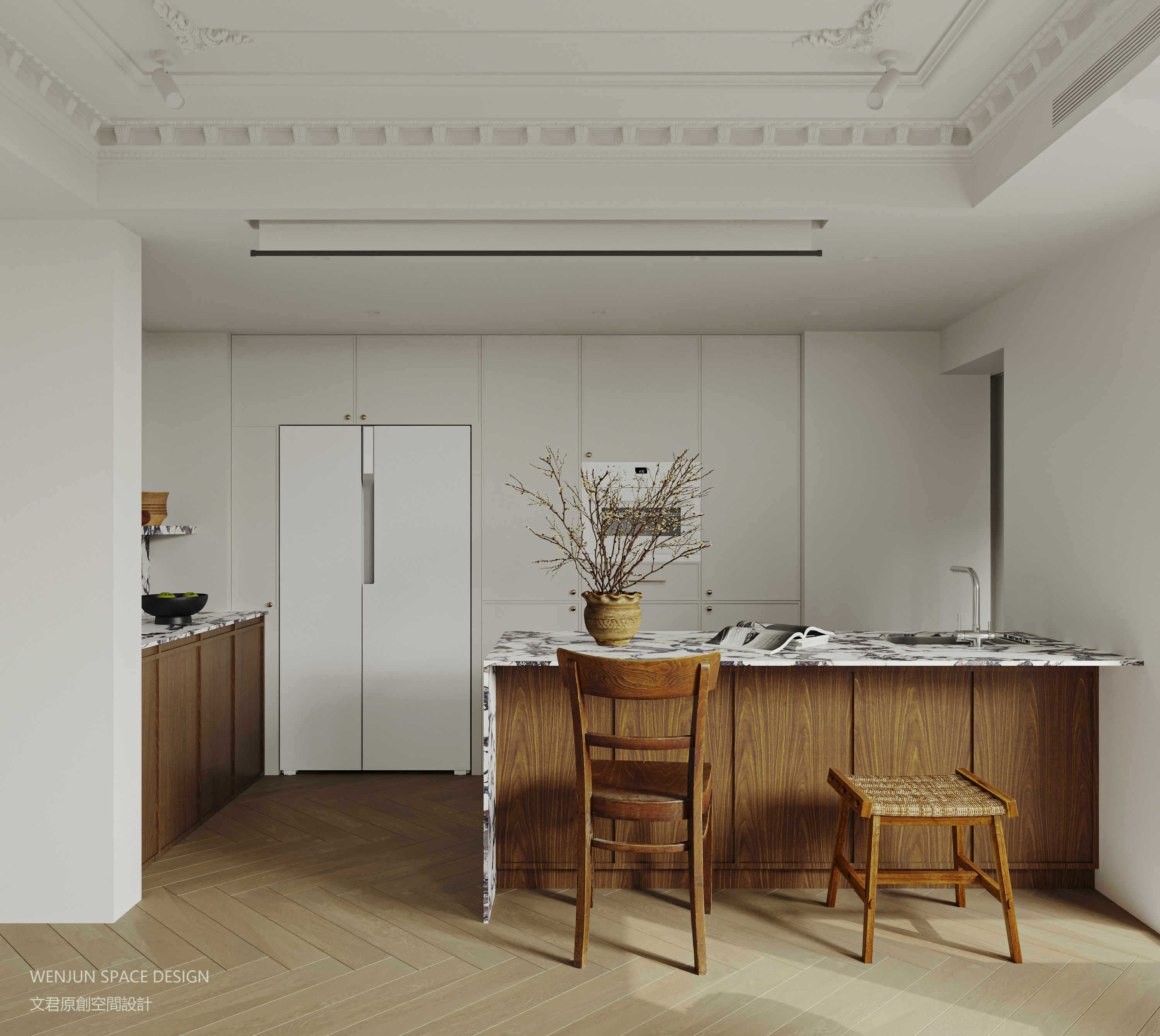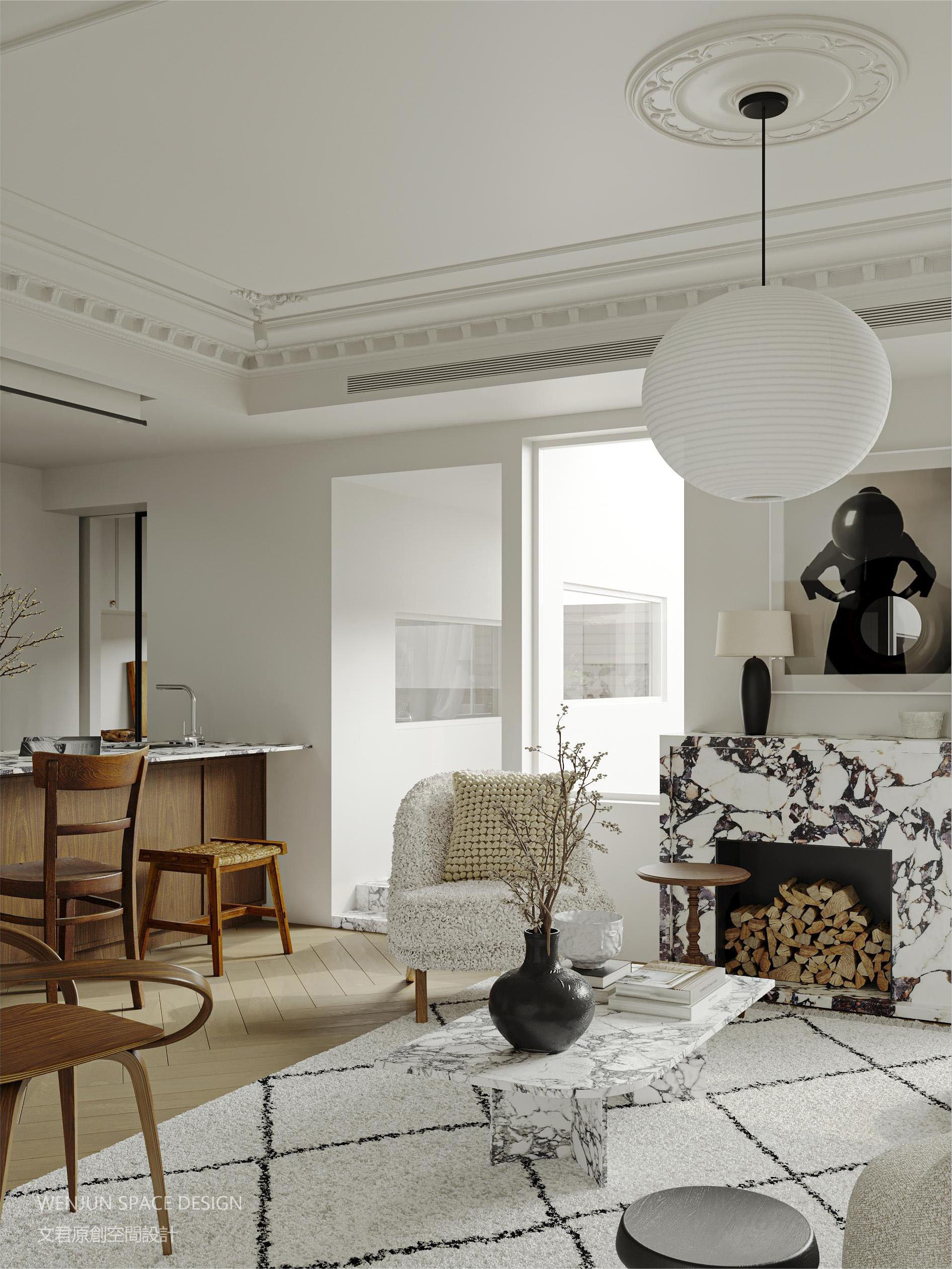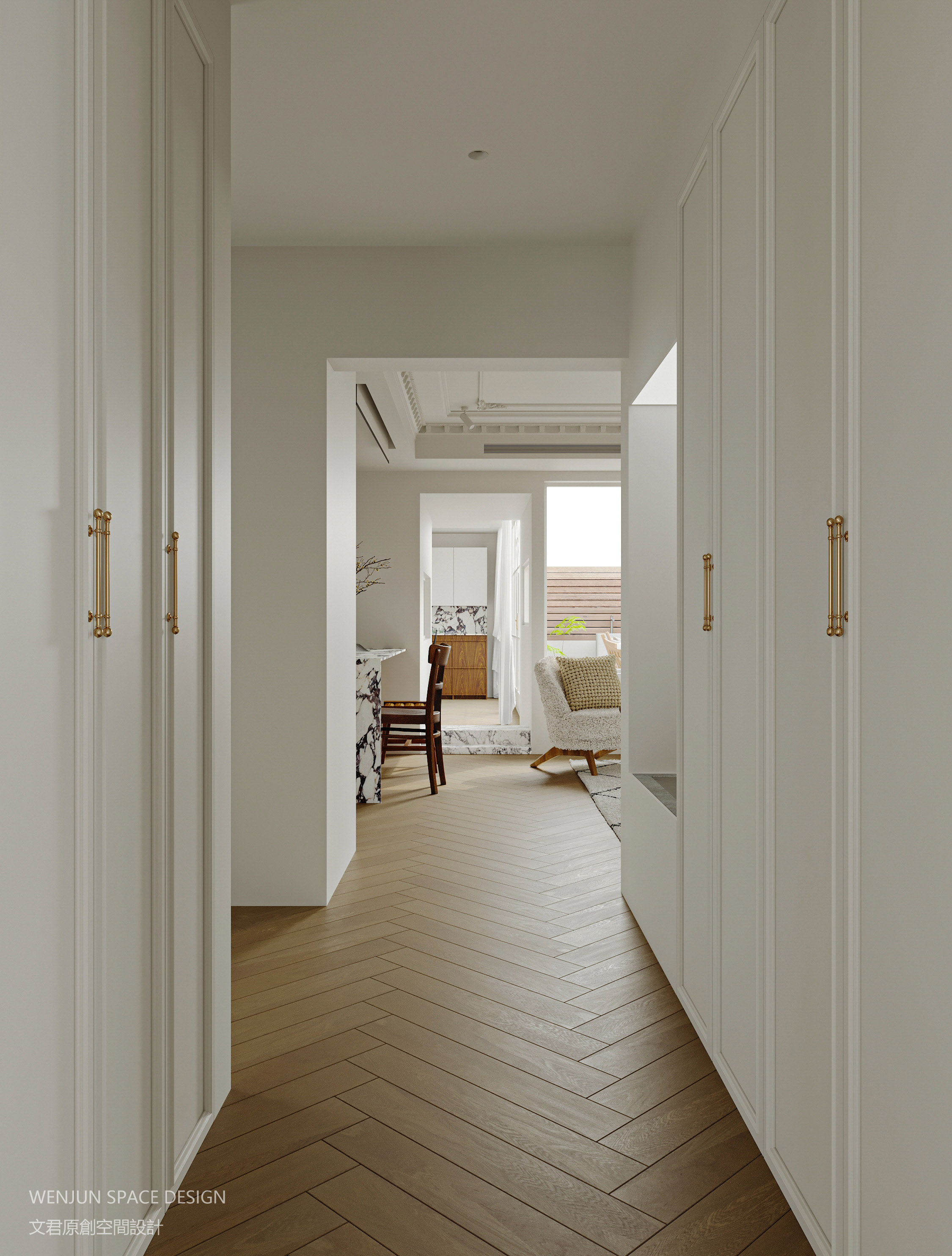 向经典的极简法式致敬。古董白的墙面、简洁的石膏线,搭配无踢脚线设计,简单素雅。