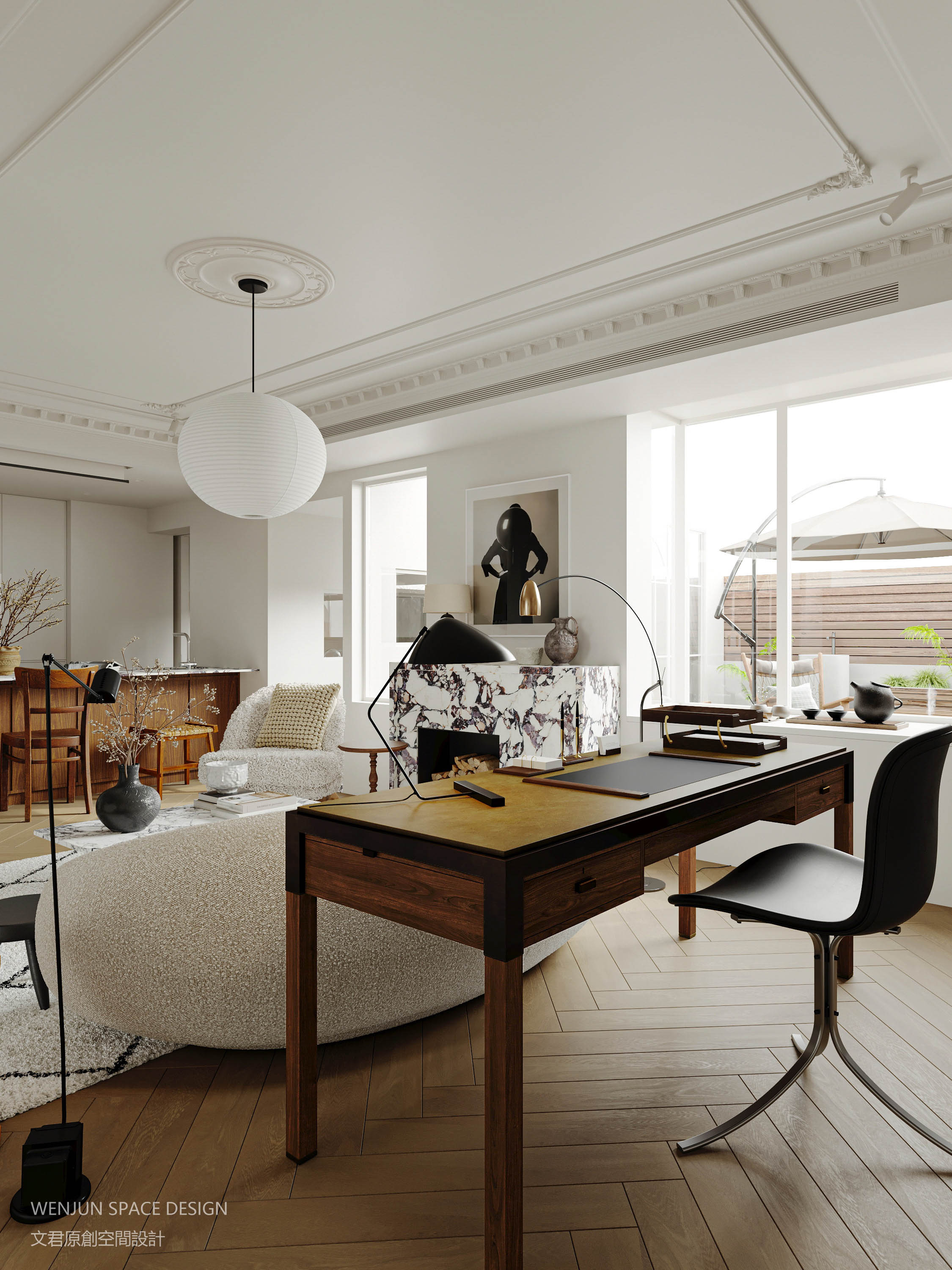 起居室、书房、西厨中岛的三个生活空间融合在一个空间,增加了生活场景的趣味性和生活气息。