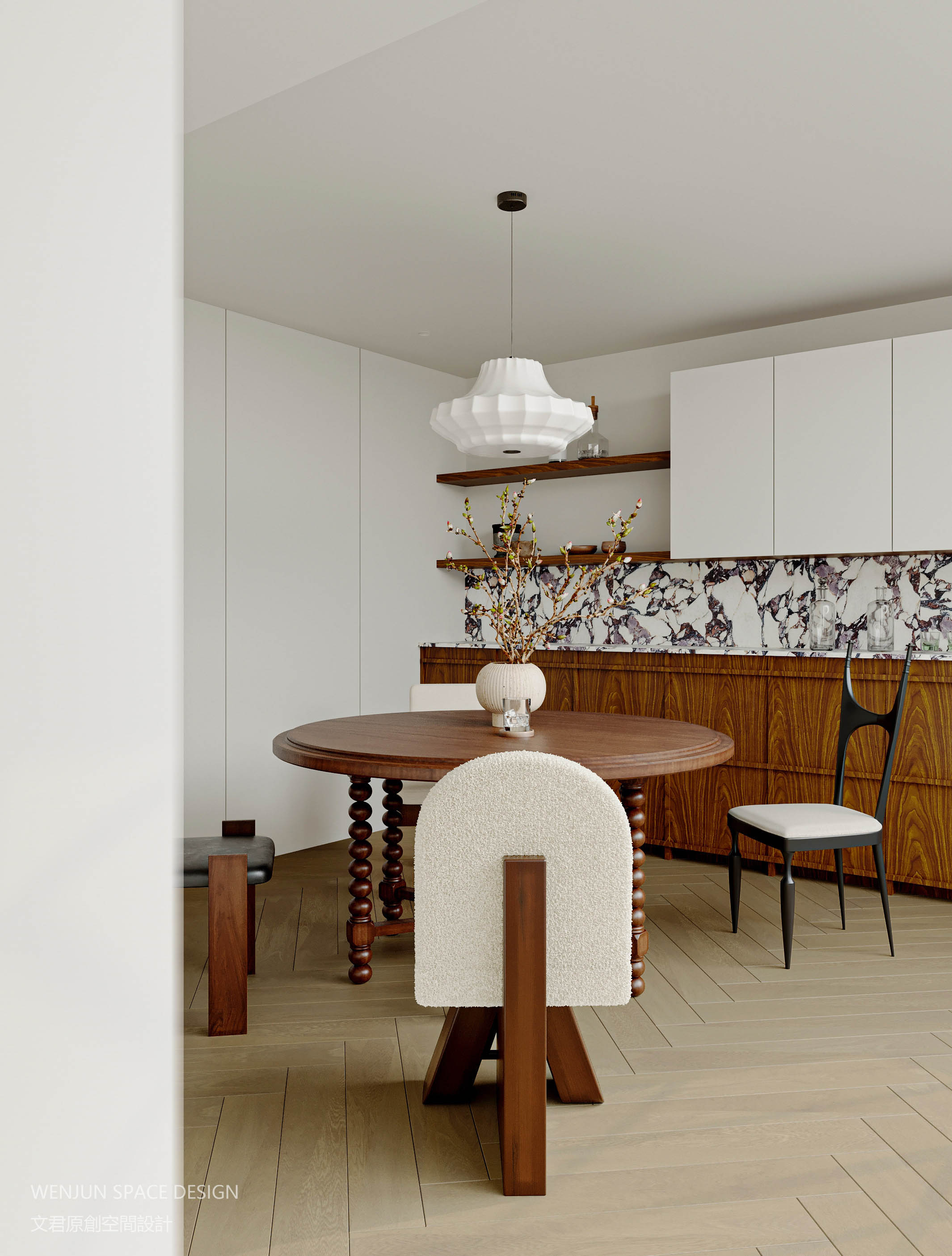 中岛台用白底黑色砖纹的大理石搭配胡桃木,流露出一种自然的奢华感。电器全部选择内嵌,干净利落。