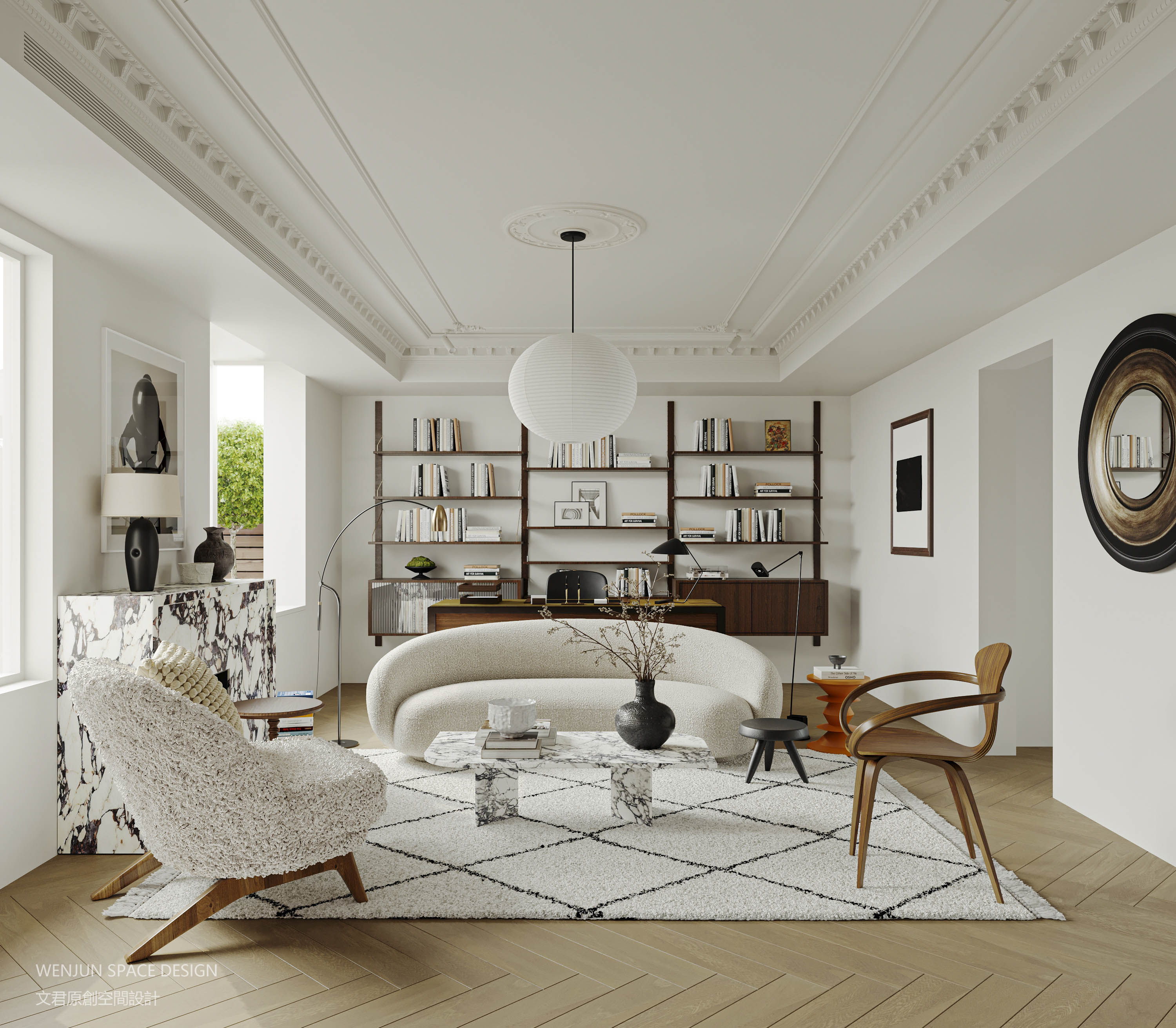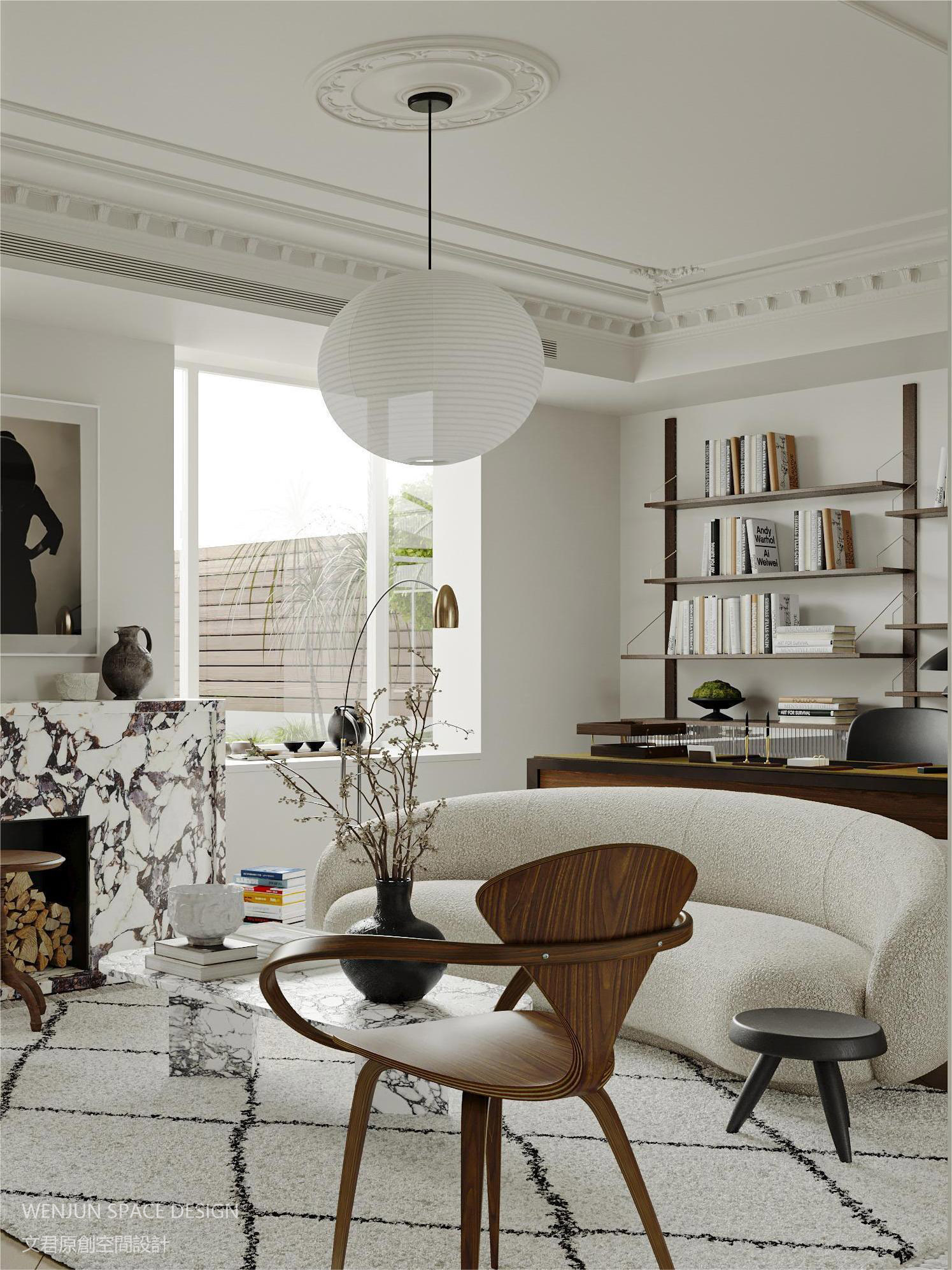 中古书架、米白弧形面包沙发、羊羔绒单椅、黑色套罐花瓶,三种左右的颜色和材质元素已经将空间的故事描述得清清楚楚。