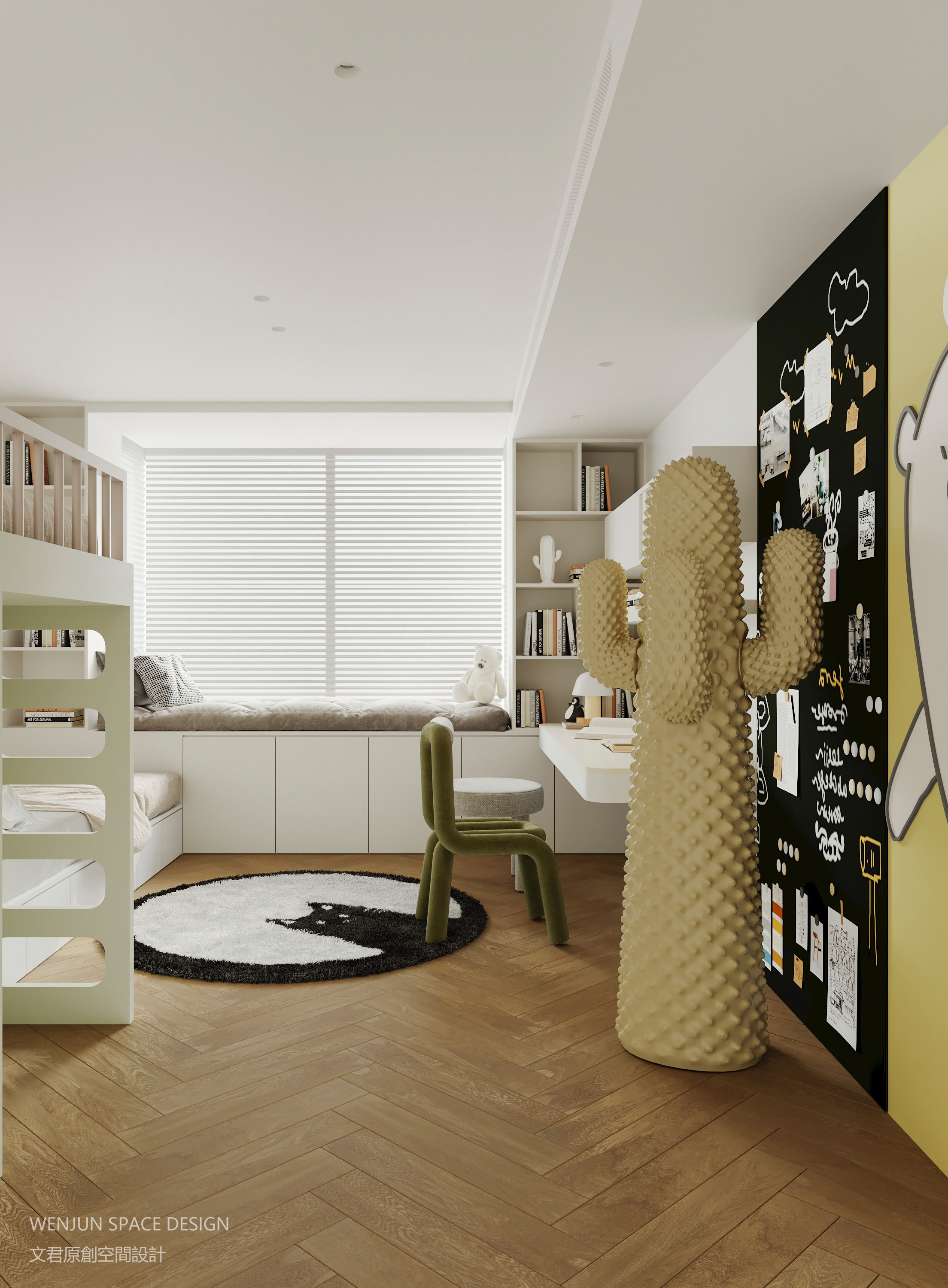 除了次卧的高低床、画板墙、玩具陈列柜的设计,在阳台区域还打造了一个体能训练空间。